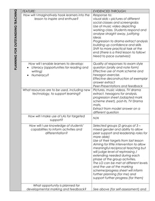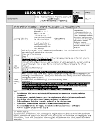 This lesson plan summarizes a lesson on analyzing representations of social class in TV drama for a class of 6 students. The lesson aims to build on skills from previous lessons in deconstructing media texts using terminology and analyzing representations and their effects through examples. Students will analyze excerpts from a TV drama and be differentiated by ability level, with some expected to discuss representations in more depth and make sophisticated connections. Resources like pictures, videos, and excerpts will be used to engage students and support learning.