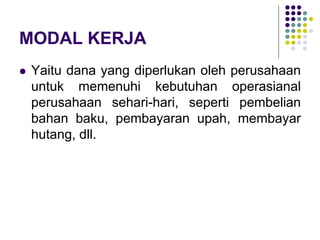 Dokumen ini membahas tentang pengolahan modal kerja yang diperlukan perusahaan untuk operasional sehari-hari, termasuk jenis-jenis dan konsep modal kerja seperti kuantitatif, kualitatif, dan fungsional. Terdapat berbagai kebijakan modal kerja yang dapat diambil perusahaan yang berdampak pada risiko dan profitabilitas, seperti kebijakan konservatif, moderat, dan agresif. Selain itu, metode untuk menentukan kebutuhan modal kerja juga dijelaskan, seperti metode keterikatan dana dan perputaran modal kerja.