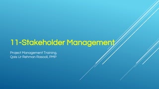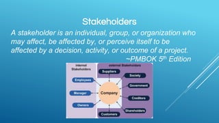 The document discusses stakeholder management in project management, highlighting the importance of identifying stakeholders, understanding their requirements, and developing strategies for engagement. It outlines processes for stakeholder analysis, including the power-interest grid and salience model, to effectively manage expectations and communication. Additionally, it emphasizes the need for continuous monitoring and relationship-building to prevent conflicts and ensure stakeholder satisfaction throughout the project lifecycle.