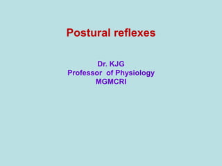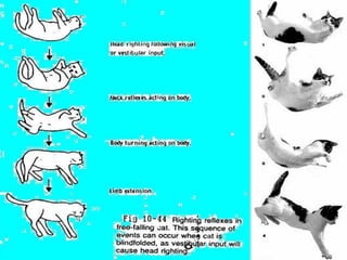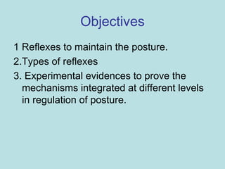 1. The document discusses various postural reflexes that help maintain upright posture and balance. It describes segmental, tonic, and righting reflexes in detail.