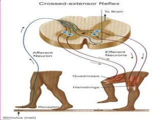 2. Segmental reflexes like the stretch reflex and crossed extensor reflex act at the spinal cord level. Tonic reflexes like the tonic neck reflex integrate signals at the medulla. Righting reflexes like the labyrinthine righting reflex restore posture at the midbrain level.