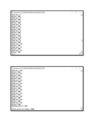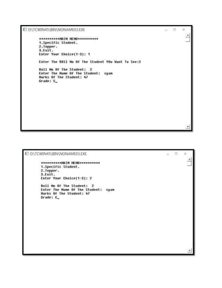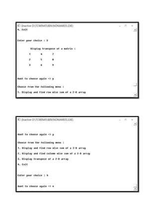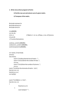 The document contains the code for a menu driven C++ program that performs various operations on matrices such as calculating row and column sums, finding the transpose, and checking if two matrices are equal. It defines functions to perform these operations and contains a main function that inputs the matrices, displays a menu, and calls the appropriate functions based on the user's selection.