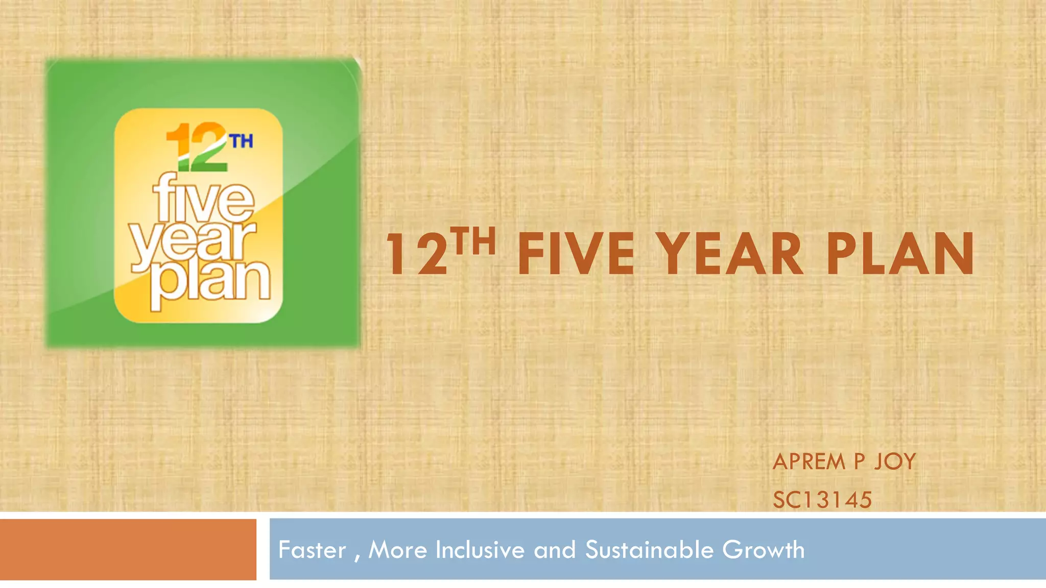 The 12th Five Year Plan aims to promote faster, more inclusive and sustainable growth in India after high growth but increasing inequities in the 11th Plan. It sets a core target of 8.2% economic growth along with manufacturing growth of 10% and poverty reduction. Key priorities include improving access to education, health and infrastructure while ensuring balanced regional development and closing gender and social gaps. The plan proposes three scenarios for growth and inclusiveness depending on the level of implementation but is limited in metrics to properly measure inclusive growth.