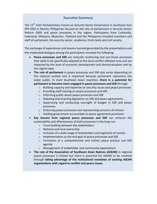 The 12th Inter-Parliamentary Forum on Security Sector Governance in Southeast Asia examined the role of parliaments in security sector reform (SSR) and peace processes. Key findings highlighted the interconnection between SSR and peace processes, emphasizing that parliaments can enhance engagement through capacity building, public awareness, and oversight of SSR and peace agreements. The discussions emphasized the need for a comprehensive approach, inclusion of diverse stakeholders, and the importance of local adaptation in addressing security challenges in the region.