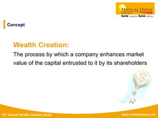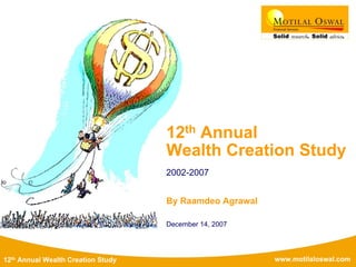 The document presents the 12th Annual Wealth Creation Study for the period 2002-2007, detailing the wealth generated by Indian companies and sectors during that time. It identifies the top wealth creators, fastest wealth creators, and the impact of various indicators such as price-to-earnings ratio and industry sectors on wealth creation. Additionally, it highlights key trends in India's economic growth, including a significant shift from public to private sector wealth creation.