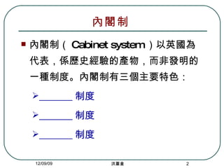 本文件探讨了三种主要的政治制度:内阁制、总统制和双首长制。其中,内阁制以信任和责任制度为特点,总统制适用于分权体系,但总统不需向国会负责,而双首长制则体现了行政权力的分配与合作。每种制度的权力关系和运作机制均有所不同,影响国家治理和政治生态。