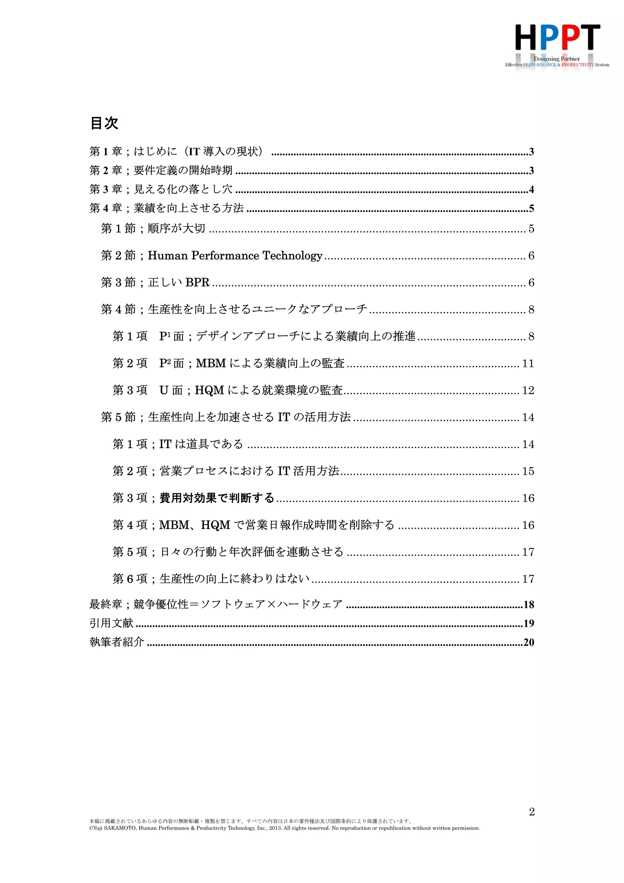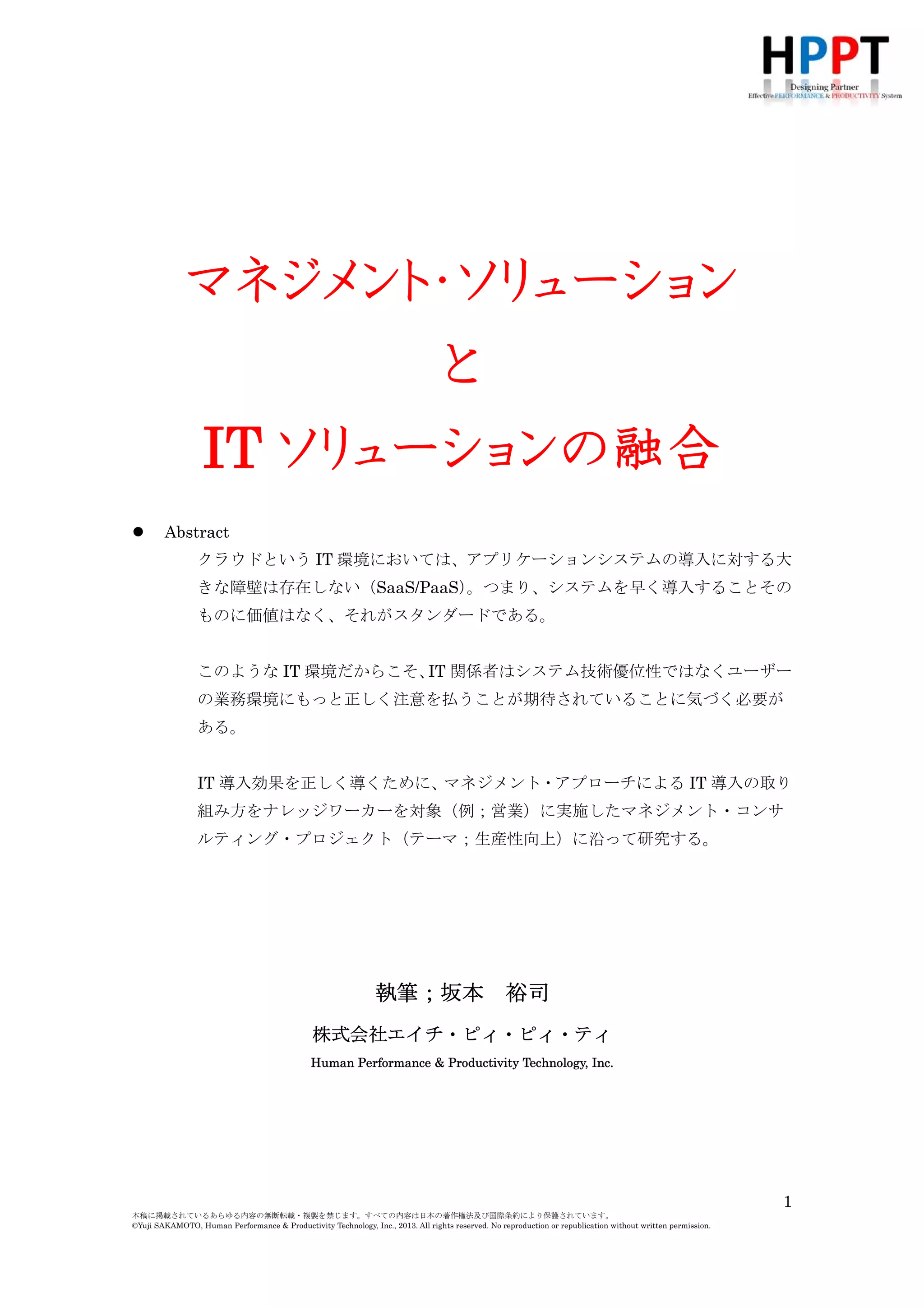 IT導入効果を正しく導くために、マネジメント・アプローチによるIT導入の取り組み方をナレッジワーカーを対象(例;営業)に実施したマネジメント・コンサルティング・プロジェクト(テーマ;生産性向上)に沿って研究する。