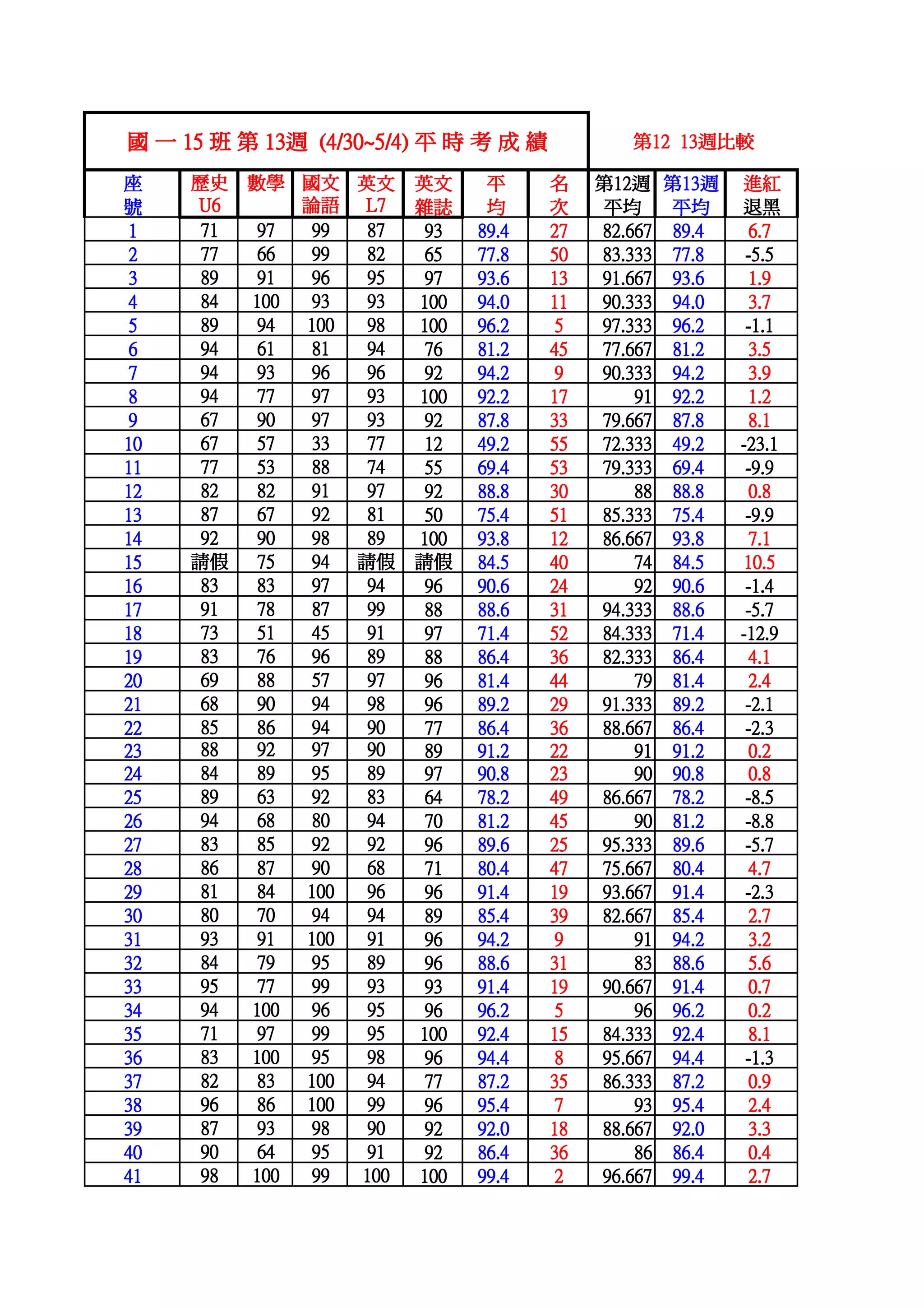 班 第 13週 (4/30~5/4) 平 時 考 成 績 13週 30~ 第12 13週比較 13週比較 座 歷史 數學 國文 英文 英文 平 名 第12週 第13週 12週 13週 進紅 號 U6 論語 L7 雜誌 均 次 平均 平均 退黑 1 71 97 99 87 93 89.4 27 82.667 89.4 6.7 2 77 66 99 82 65 77.8 50 83.333 77.8 -5.5 3 89 91 96 95 97 93.6 13 91.667 93.6 1.9 4 84 100 93 93 100 94.0 11 90.333 94.0 3.7 5 89 94 100 98 100 96.2 5 97.333 96.2 -1.1 6 94 61 81 94 76 81.2 45 77.667 81.2 3.5 7 94 93 96 96 92 94.2 9 90.333 94.2 3.9 8 94 77 97 93 100 92.2 17 91 92.2 1.2 9 67 90 97 93 92 87.8 33 79.667 87.8 8.1 10 67 57 33 77 12 49.2 55 72.333 49.2 -23.1 11 77 53 88 74 55 69.4 53 79.333 69.4 -9.9 12 82 82 91 97 92 88.8 30 88 88.8 0.8 13 87 67 92 81 50 75.4 51 85.333 75.4 -9.9 14 92 90 98 89 100 93.8 12 86.667 93.8 7.1 15 請假 75 94 請假 請假 84.5 40 74 84.5 10.5 16 83 83 97 94 96 90.6 24 92 90.6 -1.4 17 91 78 87 99 88 88.6 31 94.333 88.6 -5.7 18 73 51 45 91 97 71.4 52 84.333 71.4 -12.9 19 83 76 96 89 88 86.4 36 82.333 86.4 4.1 20 69 88 57 97 96 81.4 44 79 81.4 2.4 21 68 90 94 98 96 89.2 29 91.333 89.2 -2.1 22 85 86 94 90 77 86.4 36 88.667 86.4 -2.3 23 88 92 97 90 89 91.2 22 91 91.2 0.2 24 84 89 95 89 97 90.8 23 90 90.8 0.8 25 89 63 92 83 64 78.2 49 86.667 78.2 -8.5 26 94 68 80 94 70 81.2 45 90 81.2 -8.8 27 83 85 92 92 96 89.6 25 95.333 89.6 -5.7 28 86 87 90 68 71 80.4 47 75.667 80.4 4.7 29 81 84 100 96 96 91.4 19 93.667 91.4 -2.3 30 80 70 94 94 89 85.4 39 82.667 85.4 2.7 31 93 91 100 91 96 94.2 9 91 94.2 3.2 32 84 79 95 89 96 88.6 31 83 88.6 5.6 33 95 77 99 93 93 91.4 19 90.667 91.4 0.7 34 94 100 96 95 96 96.2 5 96 96.2 0.2 35 71 97 99 95 100 92.4 15 84.333 92.4 8.1 36 83 100 95 98 96 94.4 8 95.667 94.4 -1.3 37 82 83 100 94 77 87.2 35 86.333 87.2 0.9 38 96 86 100 99 96 95.4 7 93 95.4 2.4 39 87 93 98 90 92 92.0 18 88.667 92.0 3.3 40 90 64 95 91 92 86.4 36 86 86.4 0.4 41 98 100 99 100 100 99.4 2 96.667 99.4 2.7