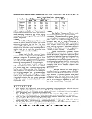 This document summarizes a study on the physical fitness components of urban and rural Haryana basketball players between ages 16-19. It finds that rural players have significantly higher endurance, speed, strength, and flexibility compared to urban players. The only component without a significant difference is agility. This is likely because rural players perform domestic duties and have healthier diets, contributing to better physical fitness. The study utilized tests for components like cardio-respiratory endurance, muscular power, speed, flexibility, and agility. It provides guidelines on the relationship between physical fitness and basketball performance.