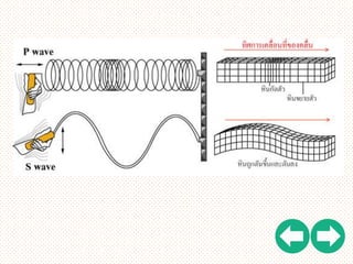 waves) ซึ่งมี 2 ลักษณะ คือ คลื่นปฐมภูมิ (P wave) เป็นคลื่นตามยาวที่เกิดจากความไหว สะเทือนในตัวกลาง โดยอนุภาคของตัวกลางนั้นเกิดการเคลื่อนไหวแบบ อัดขยายในแนวเดียวกับที่คลื่นส่งผ่านไป คลื่นนี้สามารถเคลื่อนที่ผ่าน ตัวกลางที่เป็นของแข็ง ของเหลว และก๊าซ เป็นคลื่นที่สถานีวัด แรงสั่นสะเทือนสามารถรับได้ก่อนชนิดอื่น โดยมีความเร็วประมาณ 6 – 8 กิโลเมตร/วินาที คลื่นปฐมภูมิทาให้เกิดการอัดหรือขยายตัวของชั้นหิน