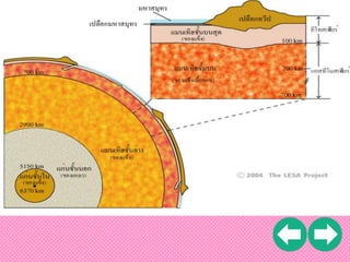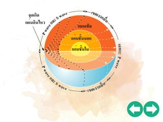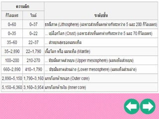 12.3 กิโลเมตร เท่านั้น สาหรับการศึกษาโครงสร้างภายในของโลกโดยทางอ้อม ได้ จากการศึกษาคลื่นไหวสะเทือนที่เกิดจากแผ่นดินไหวและจากการ ทดลองของมนุษย์