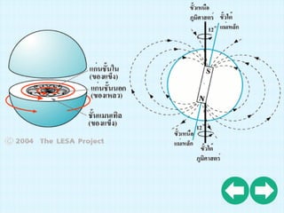 มีความกดดันสูงจึงมีสถานะเป็นของแข็ง ส่วนแก่นชั้นนอก (Outer core) มีความกดดันน้อยกว่าจึงมีสถานะเป็นของเหลวหนืด แก่นชั้นในมี อุณหภูมิสูงกว่าแก่นชั้นนอก พลังงานความร้อนจากแก่นชั้นใน จึง ถ่ายเทขึ้นสู่แก่นชั้นนอกด้วยการพาความร้อน (Convection) เหล็กหลอม ละลายเคลื่อนที่หมุนวนอย่างช้าๆ ทาให้เกิดการเคลื่อนที่ของกระแสไฟฟ้า และเหนี่ยวนาให้เกิดสนามแม่เหล็กโลก (The Earth’s magnetic field)
