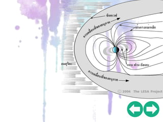 อิทธิพล ของลมสุริยะทาให้ด้านที่อยู่ใกล้ดวงอาทิตย์มีความกว้างน้อยกว่า ด้านตรงข้ามดวงอาทิตย์ สนามแม่เหล็กโลกไม่ใช่สิ่งคงที่ แต่มีการ เปลี่ยนแปลงความเข้มและสลับขั้วเหนือ-ใต้ ทุกๆ หนึ่งหมื่นปี ใน ปัจจุบันสนามแม่เหล็กโลกอยู่ในช่วงที่มีกาลังอ่อน สนามแม่เหล็ก โลกเป็นสิ่งที่จาเป็นที่เอื้ออานวยในการดารงชีวิต หากปราศจาก สนามแม่เหล็กโลกแล้ว อนุภาคพลังงานสูงจากดวงอาทิตย์และ อวกาศ จะพุ่งชนพื้นผิวโลก ทาให้สิ่งมีชีวิตไม่สามารถดารงอยู่ได้ (ดู รายละเอียดเพิ่มเติมในบทที่ 3 พลังงานจากดวงอาทิตย์)