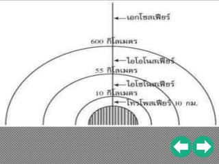 600กิโลเมตรขึ้น ไปจากผิวโลก บรรยากาศมีออกซิเจนจางมากๆ และมีก๊าซฮีเลียมและไฮโดรเจนอยู่เป็นส่วนมาก โดยมีชั้นติดต่อกับอวกาศ โลกมีอุณหภูมิ 15 องศาเซลเซียส โดยเฉลี่ย