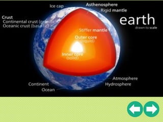 ส่วน โดยพิจารณาจากองค์ประกอบทางเคมี ดังนี้ เปลือกโลก (Crust) เป็นผิวโลกชั้นนอก มีองค์ประกอบ ส่วนใหญ่เป็นซิลิกอนไดออกไซด์ และอะลูมิเนียมออกไซด์
