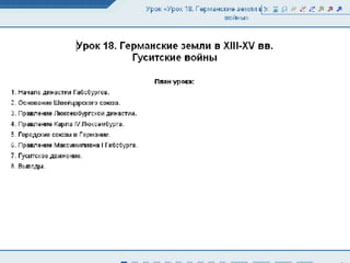 Документ охватывает историческое развитие германских земель в 13-15 веках и рассматривает гуситские войны. Он предназначен для 10-классников в рамках элективного курса 'страноведение Германии'. Основное внимание уделяется ключевым событиям и культурным аспектам этого периода.