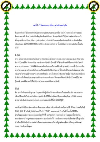 The document describes different methods of communication over the internet including email, chat, voice over IP (VoIP), and video conferencing. E-mail can be used for communication between individuals or groups. Chat options include MSN Messenger. Voice calls can be placed over the internet using VoIP technology instead of traditional phone lines. Video conferencing allows for face-to-face communication online through programs and webcams.
