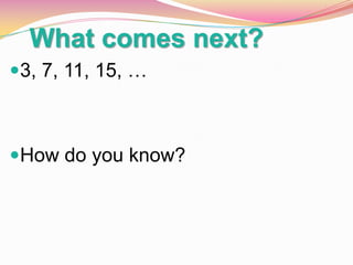 This document discusses recursive sequence definitions, which define each term in a sequence based on the previous term using a recursion formula. It provides examples of recursive definitions and how to write explicit definitions that directly define each term without recursion. It also gives practice problems for writing recursive and explicit definitions and applying them to population growth scenarios.