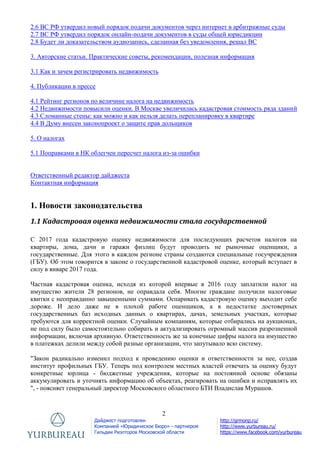 Дайджест правовых новостей для риэлторов Москвы за январь 2017 года включает ключевые изменения в законодательстве, такие как государственная кадастровая оценка недвижимости, упрощение оформления машино-мест в собственность и уточнения по изъятию единственного жилья у должников. Также представлены решения судов, подтверждающие права дольщиков и новые правила подачи документов в суды. Документ является важным ресурсом для риэлторов, обеспечивая свежую информацию о законодательных и практических изменениях в сфере недвижимости.