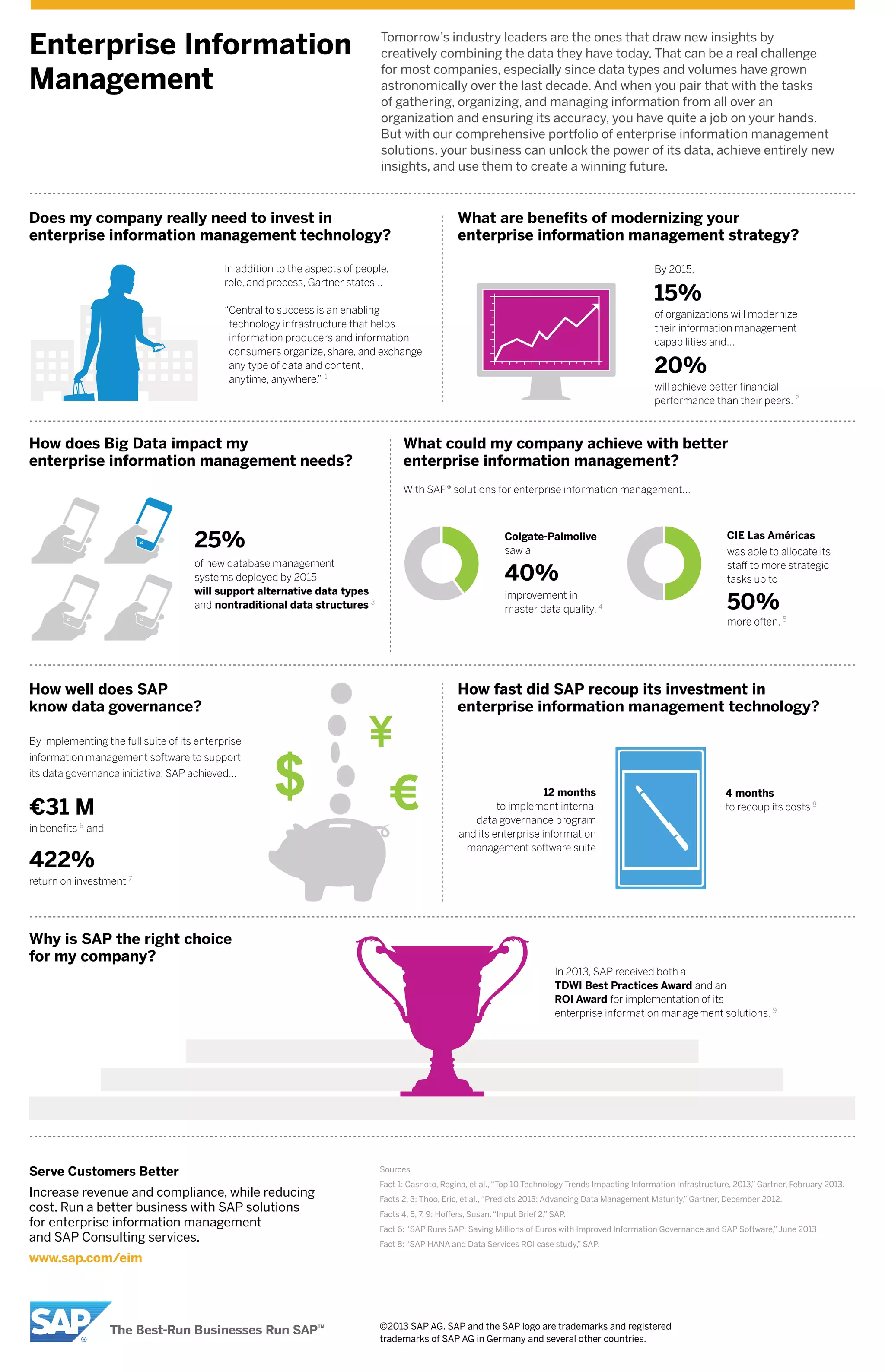 The document discusses the importance of enterprise information management (EIM) for modern businesses, highlighting the challenges of managing diverse data types and volumes. It emphasizes the benefits of utilizing SAP's EIM solutions to enhance data accuracy, improve financial performance, and achieve strategic goals. The document also references successful case studies and awards related to SAP's implementation of EIM technologies.