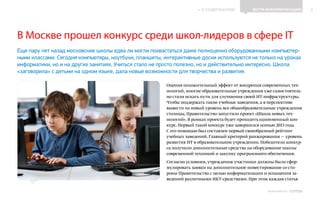 Документ обсуждает проект «Школа новых технологий», инициированный правительством Москвы для модернизации IT-инфраструктуры школ. В рамках проекта проводятся конкурсы для оценки и поддержки образовательных учреждений, с целью внедрения новых технологий и индивидуальных образовательных траекторий для учеников. Также акцентируется внимание на важности информационных технологий в процессе обучения и адаптации первоклассников в школе, подчеркивая необходимость тренировки учителей и создания комфортной учебной среды.