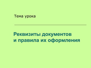 Документ описывает требования к оформлению реквизитов организационно-распорядительных документов согласно ГОСТ Р 6.30-2003. В нем перечислены основные реквизиты, включая гербы, наименования, регистрационные номера и подписи, а также правила их расположения и оформления. Также рассматриваются правила утверждения и согласования документов.