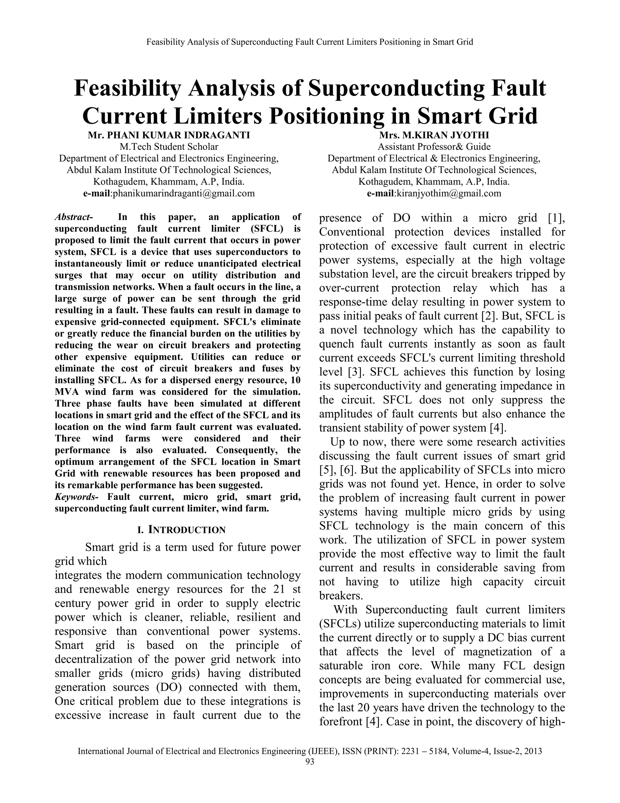 This document analyzes the optimal positioning of superconducting fault current limiters (SFCLs) in smart grids. It simulates different fault scenarios in a model smart grid containing distributed generation from wind farms. It finds that installing an SFCL at the substation or distribution network increases fault current from wind farms. The best performance is achieved by installing a single SFCL at the point of integration between the wind farm and the grid. This location limits fault current from both the wind farm and the main power system effectively without negative impacts. The analysis suggests strategic placement of SFCLs at integration points is most efficient for protecting multiple distributed resources in smart grids.