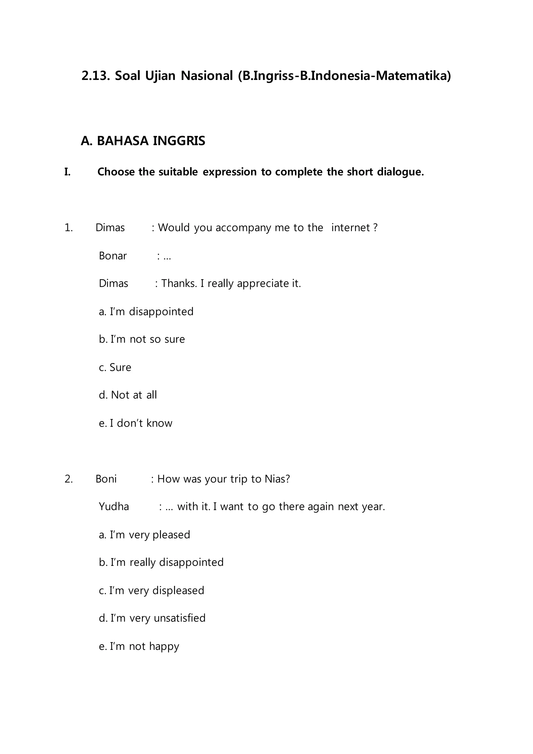 Dokumen ini berisi soal ujian nasional yang mencakup berbagai topik, seperti bahasa Inggris, undangan, pengumuman, dan pertanyaan tentang berbagai teks, termasuk budaya dan transportasi di New York. Beberapa soal menguji pemahaman siswa terhadap dialog dan arti kata-kata dalam konteks kalimat. Terdapat juga kisah fabel yang menggambarkan persahabatan antara seekor singa dan seekor serigala.