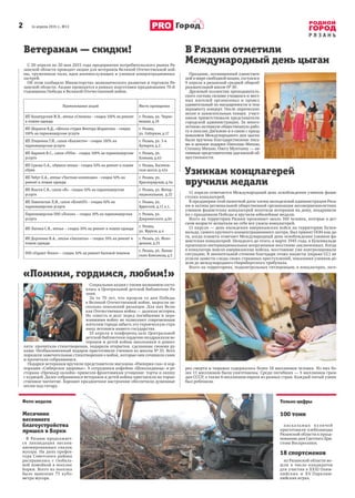 Документ содержит информацию о праздничных мероприятиях и социальных акциях в Рязани, включая скидки для ветеранов Великой Отечественной войны и мероприятия, посвященные Международному дня освобождения узников фашистских концлагерей. Также обсуждается благоустройство города, проблемы парковки и установка новых светофоров для повышения безопасности. В завершение упоминается мемориальная доска в честь рязанца Федора Полетаева, установленная в Италии.