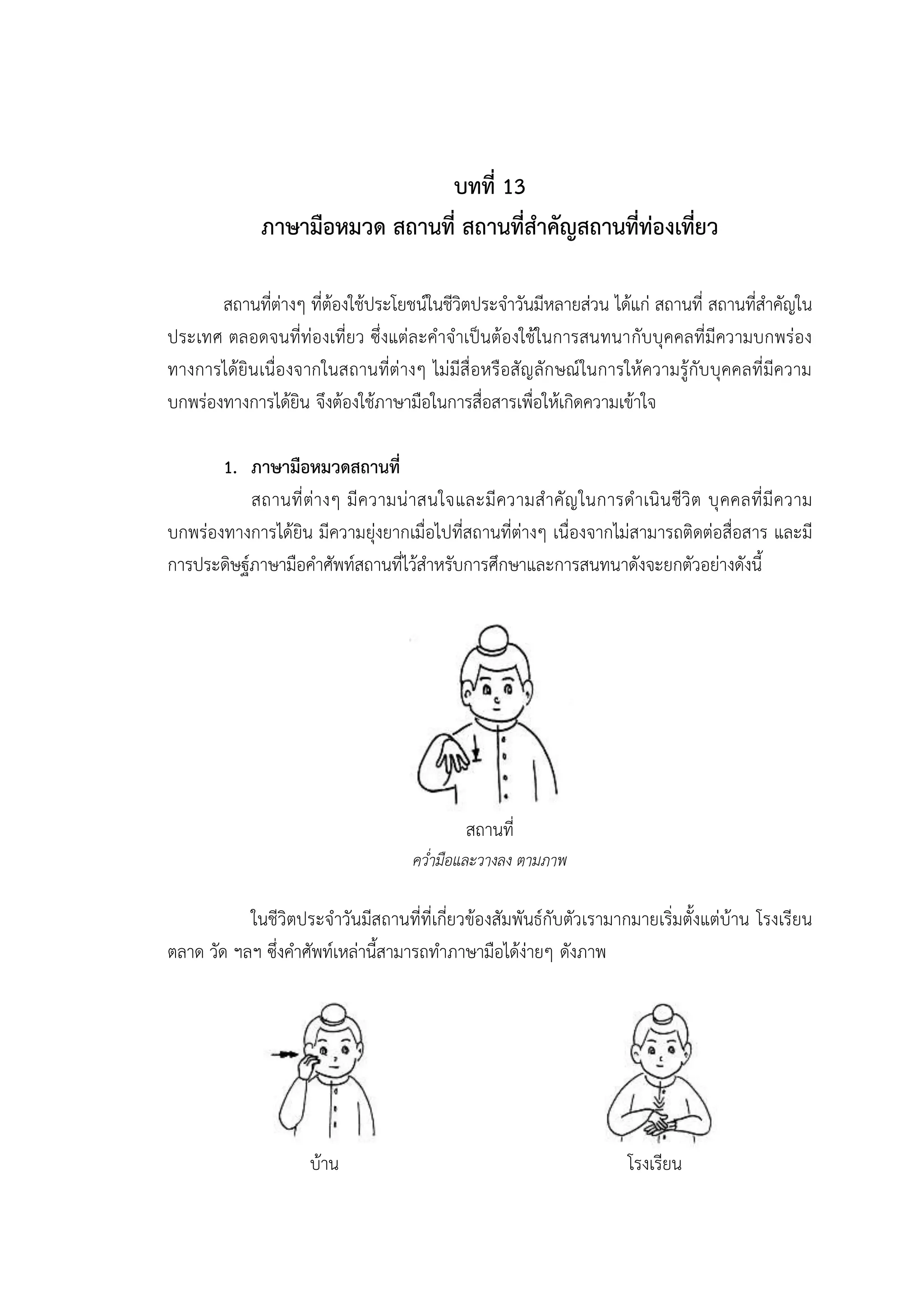 สถานที่สาคัญสถานที่ท่องเที่ยว สถานที่ต่างๆ ที่ต้องใช้ประโยชน์ในชีวิตประจาวันมีหลายส่วน ได้แก่ สถานที่ สถานที่สาคัญใน ประเทศ ตลอดจนที่ท่องเที่ยว ซึ่งแต่ละคาจาเป็นต้องใช้ในการสนทนากับบุคคลที่มีความบกพร่อง ทางการได้ยินเนื่องจากในสถานที่ต่างๆ ไม่มีสื่อหรือสัญลักษณ์ในการให้ความรู้กับบุคคลที่มีความ บกพร่องทางการได้ยิน จึงต้องใช้ภาษามือในการสื่อสารเพื่อให้เกิดความเข้าใจ 1. ภาษามือหมวดสถานที่ สถานที่ต่างๆ มีความน่าสนใจและมีความสาคัญในการดาเนินชีวิต บุคคลที่มีความ บกพร่องทางการได้ยิน มีความยุ่งยากเมื่อไปที่สถานที่ต่างๆ เนื่องจากไม่สามารถติดต่อสื่อสาร และมี การประดิษฐ์ภาษามือคาศัพท์สถานที่ไว้สาหรับการศึกษาและการสนทนาดังจะยกตัวอย่างดังนี้ สถานที่ คว่ำมือและวำงลง ตำมภำพ ในชีวิตประจาวันมีสถานที่ที่เกี่ยวข้องสัมพันธ์กับตัวเรามากมายเริ่มตั้งแต่บ้าน โรงเรียน ตลาด วัด ฯลฯ ซึ่งคาศัพท์เหล่านี้สามารถทาภาษามือได้ง่ายๆ ดังภาพ บ้าน โรงเรียน