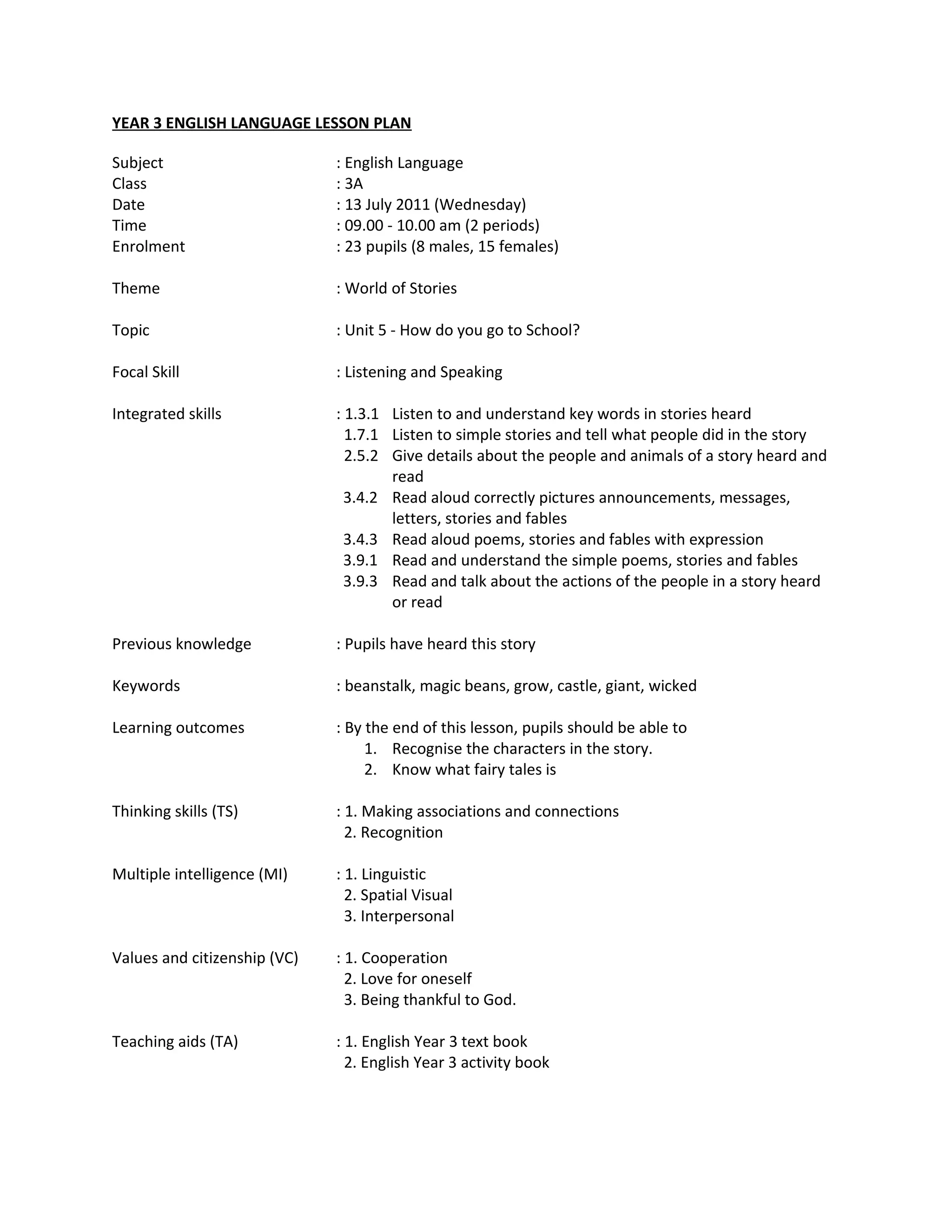 The document outlines a lesson plan for a Year 3 English class that focuses on listening, speaking, reading and writing skills through discussing the fairy tale "Jack and the Beanstalk". The plan includes introducing vocabulary, reading the story aloud, identifying characters, asking comprehension questions, retelling the story, and summarizing the moral values.
