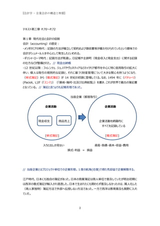 P.70~P.72 第1章 現代社会と会計の役割 会計(accounting)の歴史: ・メソポタミアの時代:記録の方法が確立して契約および領収書等が備え付けられていたという意味での 会計がシュメール人を中心として発生したといわれる。 ・ギリシャ・ローマ時代:記録方法が発達し、日記帳や主師町(現金収入と現金支出)に関する記録 の仕方などが整備された。 // 現金出納帳 ・12 世紀以降:フィレンツェ、ジェノバやヴェネティアなどのイタリア都市を中心に特に信用取引の拡大に 伴い、個人は取引の規則的な記録と、それに基づく財産管理について大きな関心を持つようになり、 (単式簿記)から(複式簿記)が 14 世紀の初頭に登場してくる。なお、1494 年に(パチョーリ) (Pacioli, L)が(「スンマ」)(「算術・幾何・比及び比例総覧」)を書き、これが世界で最古の簿記書 となっている。 // 簿記と言うよりも記帳形態であった。 当座企業(都度取引) 企業活動 企業活動 現金収支 商品売上 企業活動を網羅的に すべてを記録している [単式簿記] [複式簿記] 入りと出しか見ない 資産・負債・資本・収益・費用 損式・利益 = 損益 // 当座企業とはプロジェクト単位での企業形態。1度の航海(往復)で得た売却益で企業解散する。 江戸時代、日本にも独自の簿記があった。日本の商業簿記は商人単位で普及していたが明治初期に は西洋の複式簿記が輸入され浸透した。日本で生まれたにも関わらず普及しなかったのは、属人化した (商人家独特)簿記方法で外部へ伝授しない方法であった。一方で西洋は教育普及も視野に入れ ていた。 2