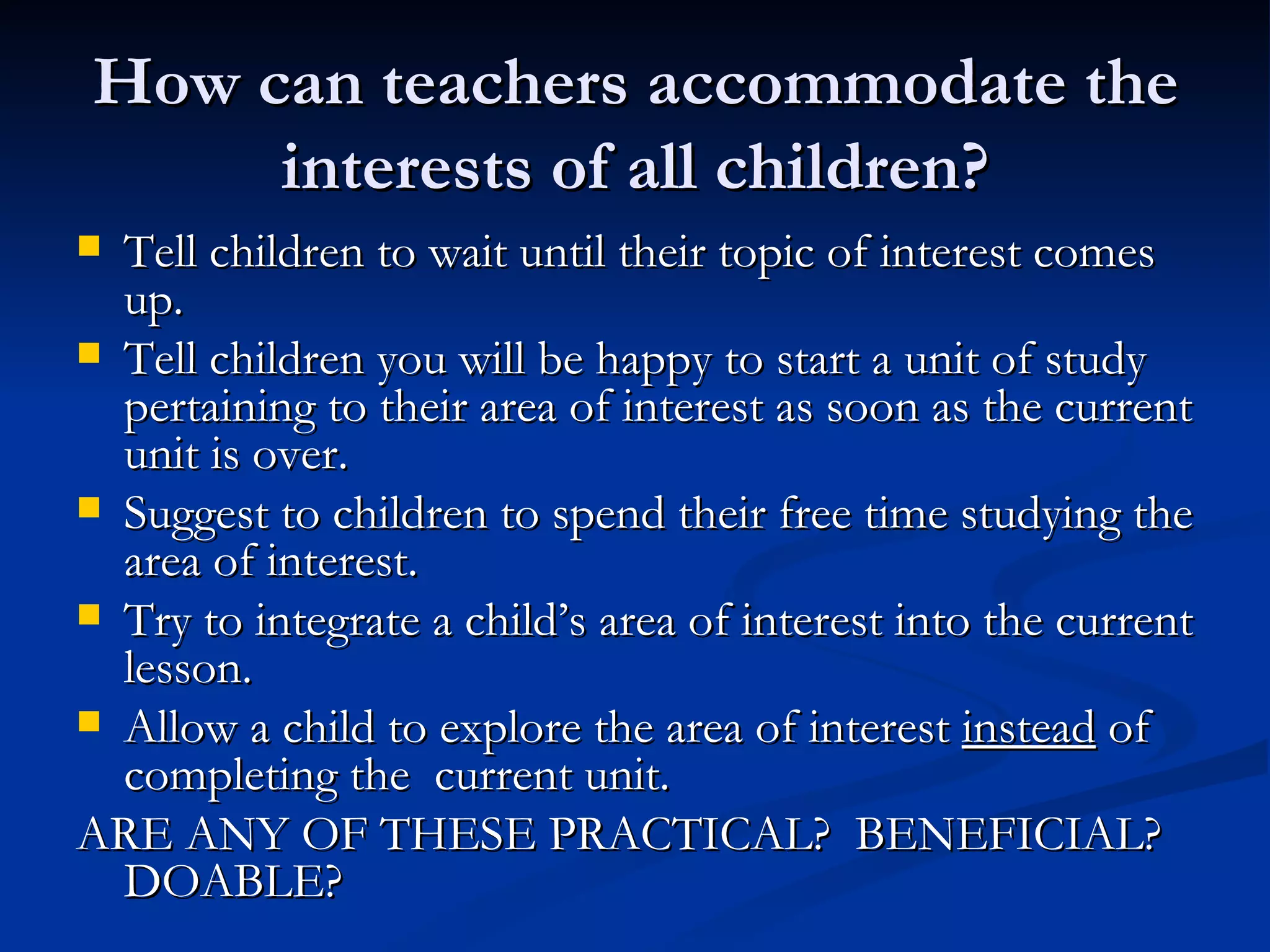 The document discusses different approaches for accommodating children's interests in the classroom and presents a cyclical teaching model based on listening to children. It proposes letting children explore their interests within lessons instead of just completing assignments. The teaching model involves teachers and students collaboratively selecting topics, planning inquiry-based activities, carrying out investigations, and evaluating outcomes. Benefits are meaningful learning through student-driven questions, while drawbacks are its demands on teacher experience and resources. The document suggests working towards using this model, perhaps later in the school year.