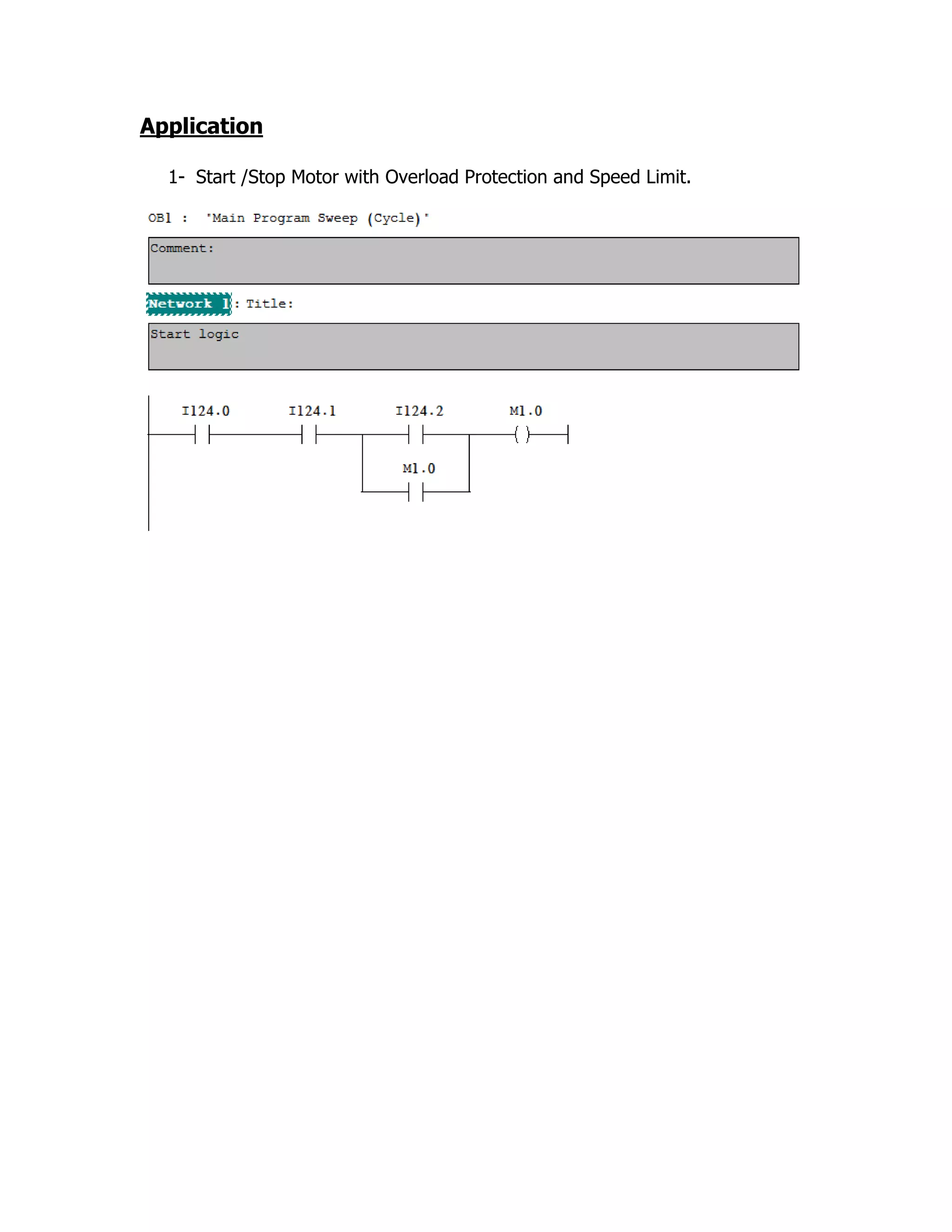 The document describes a motor control application with overload protection and speed limits, utilizing analog input for speed representation. It details the conversion process of an analog signal to a percentage for speed monitoring, ensuring that the motor does not exceed 70% of its rated speed. A set point can be established for the motor's operation, and the monitoring is facilitated by a variable table to ensure proper functionality.