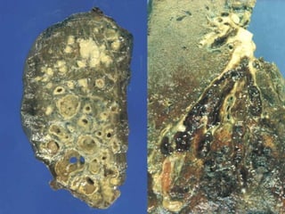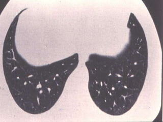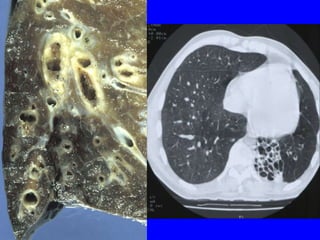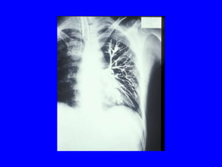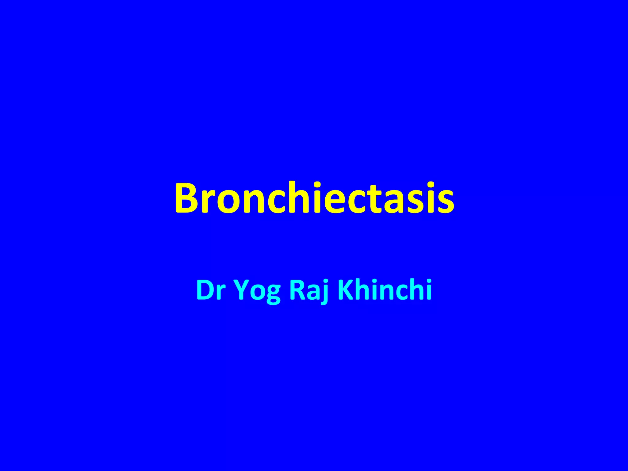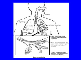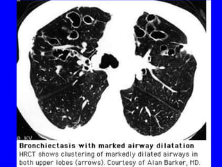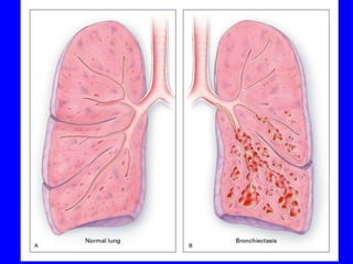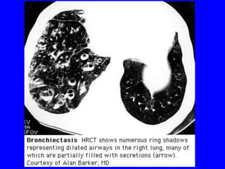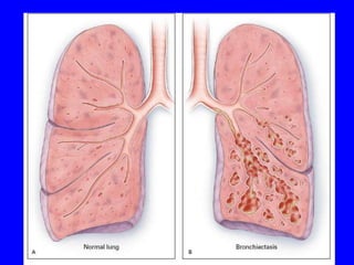 Bronchiectasis is a chronic lung disease characterized by abnormal dilatation of the bronchi. It develops due to a vicious cycle of airway injury, infection, and failure of the lungs to clear secretions. Common causes include post-infectious issues, immunodeficiencies, cystic fibrosis, and autoimmune diseases. Patients experience chronic cough, sputum production, and recurrent lung infections that can lead to further lung damage over time. Treatment focuses on reducing infection risk, promoting mucus clearance, and managing exacerbations.