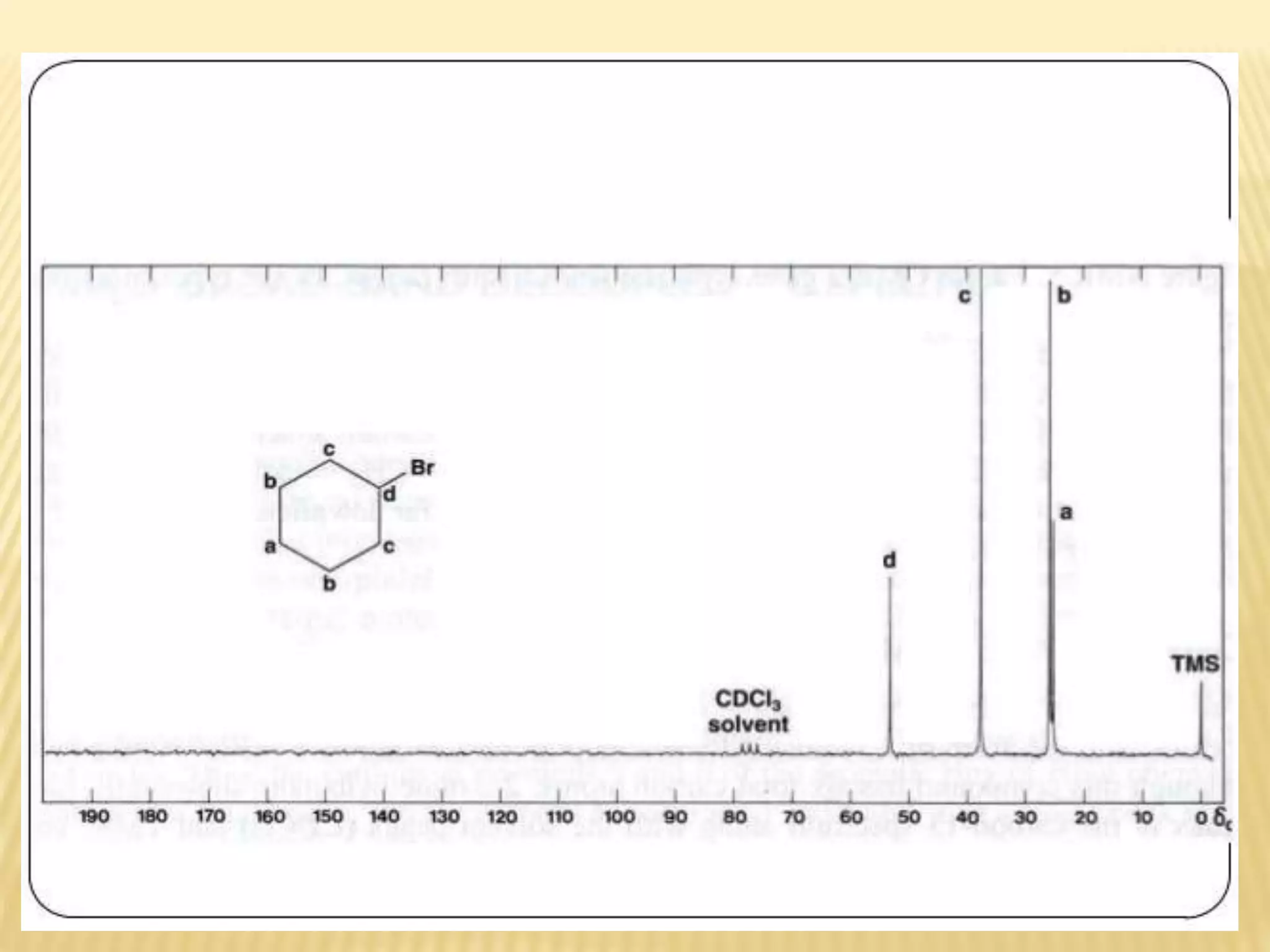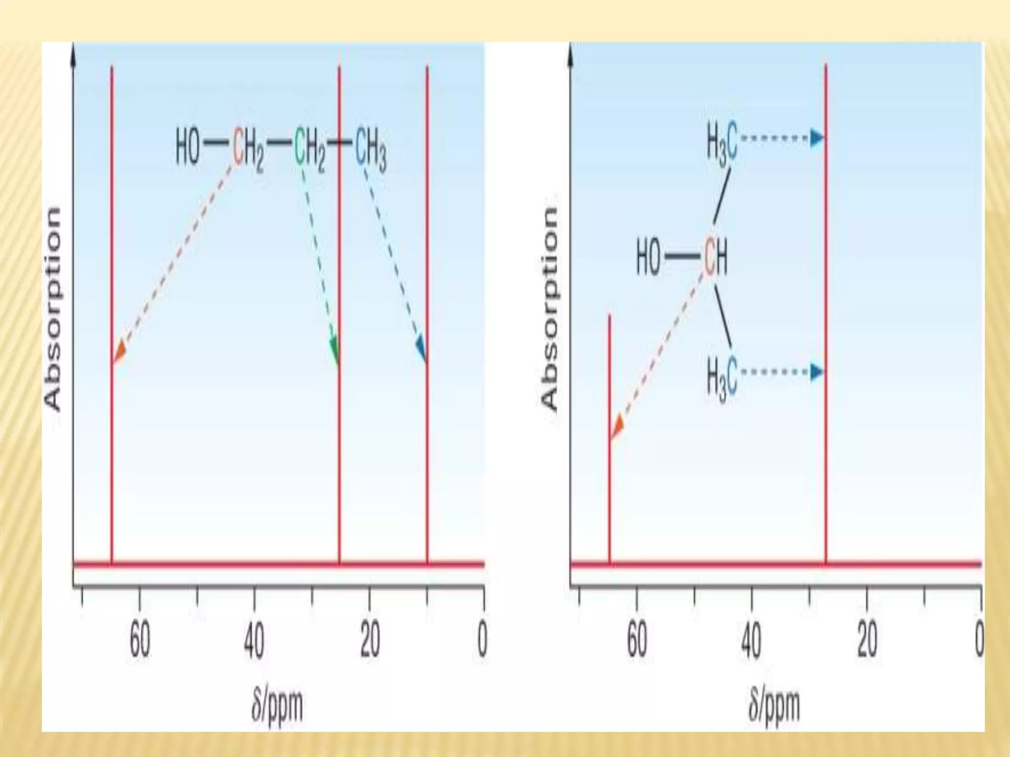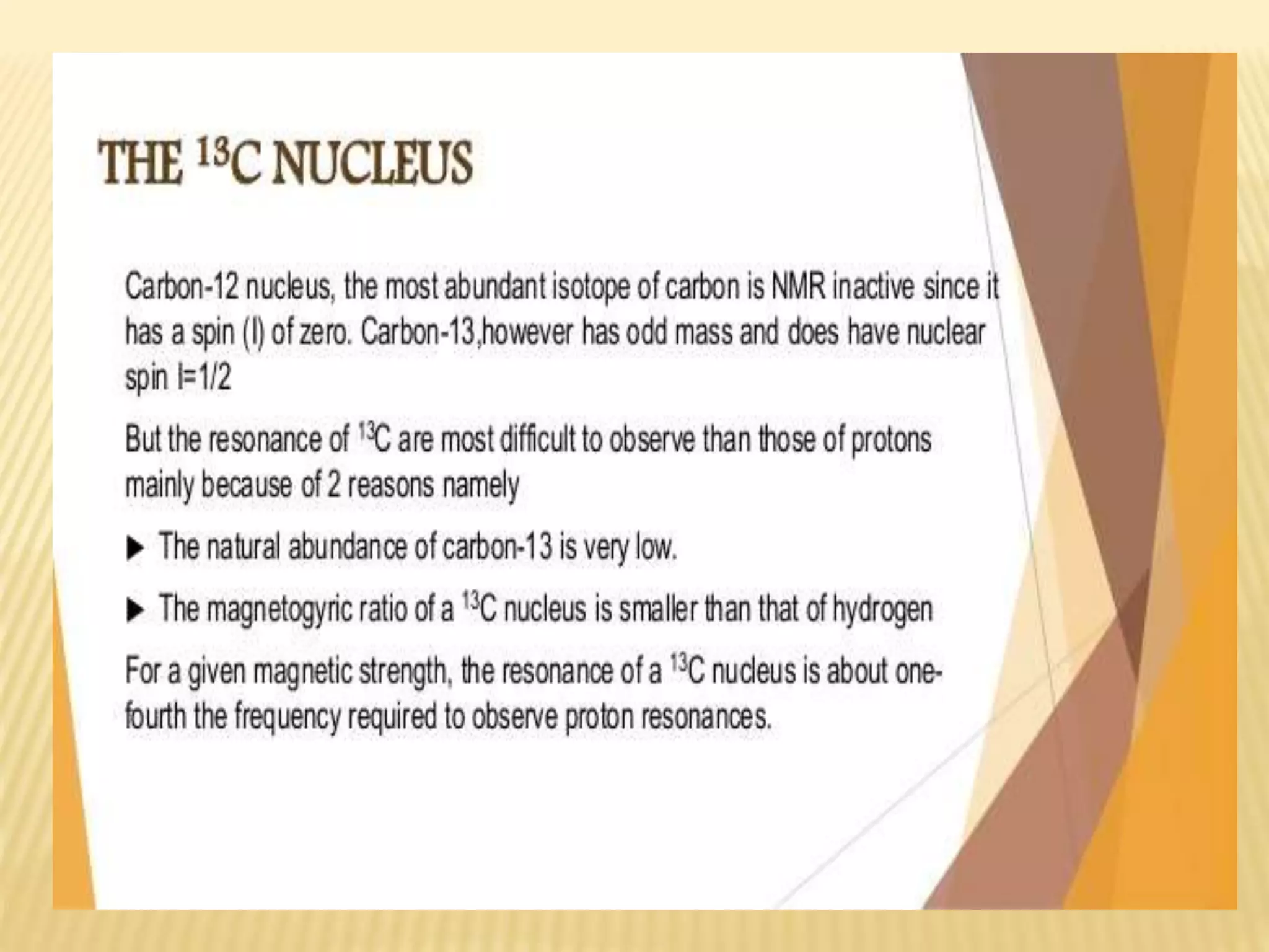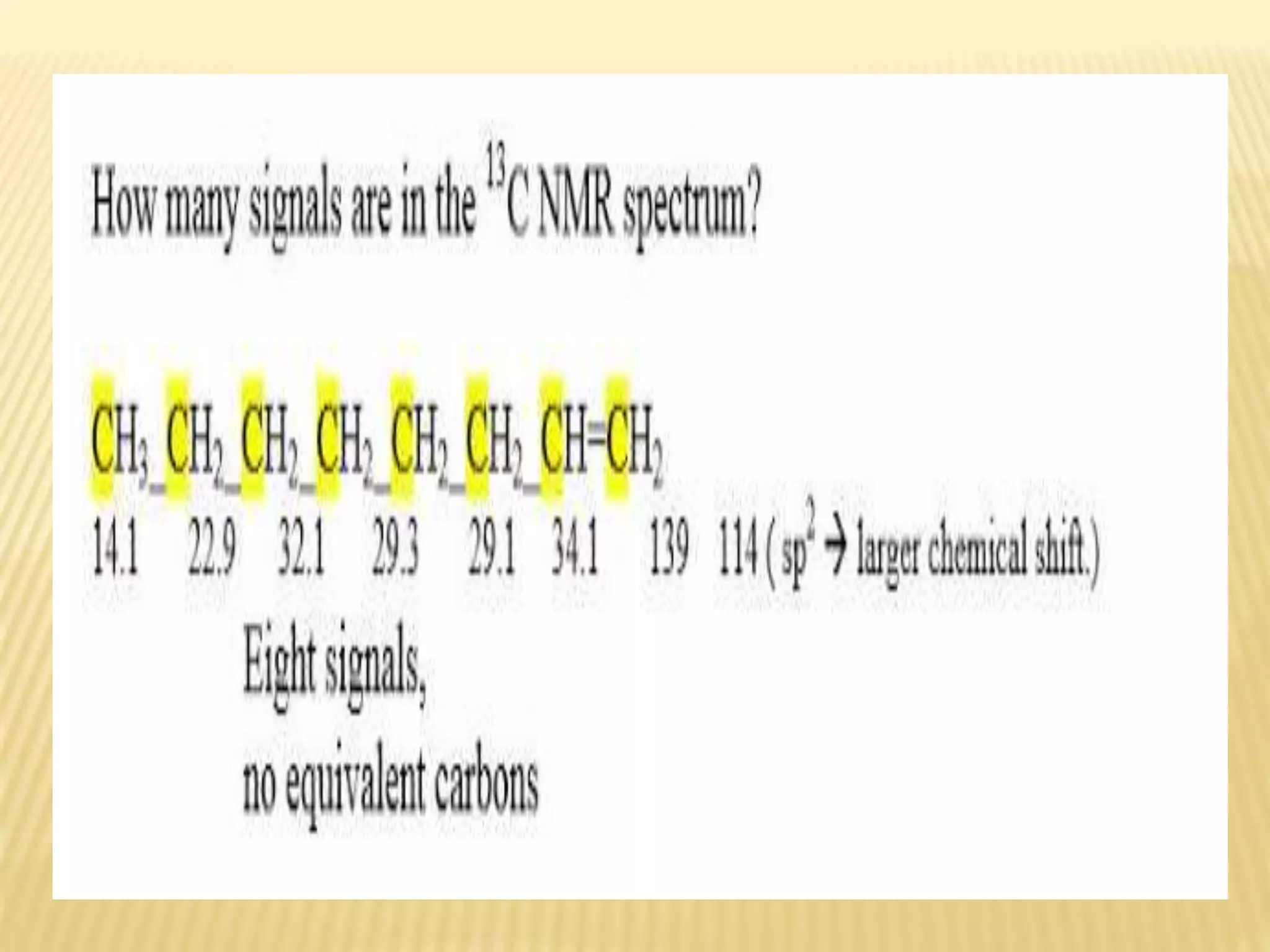 13C-NMR spectroscopy provides information about carbon atoms in organic compounds. It works by applying a strong magnetic field to excite carbon-13 nuclei, which make up about 1% of naturally occurring carbon. The document discusses several key aspects of 13C-NMR including: principles of NMR spectroscopy; chemical shifts and peak assignments; coupling patterns; techniques to overcome low carbon abundance like signal averaging and Fourier transform; and decoupling methods to simplify spectra. Examples are provided to illustrate predicting chemical shifts and interpreting 13C-NMR spectra.