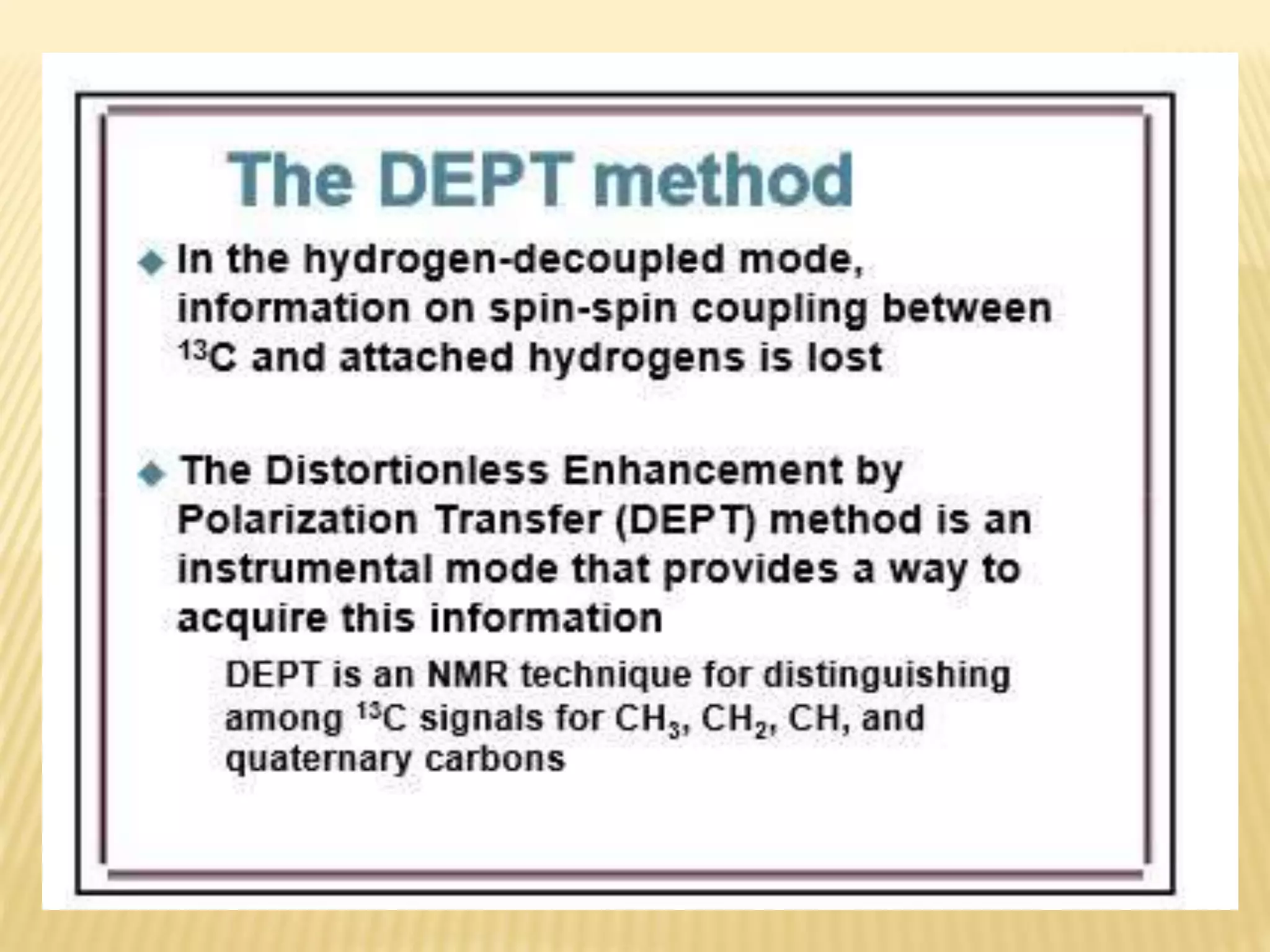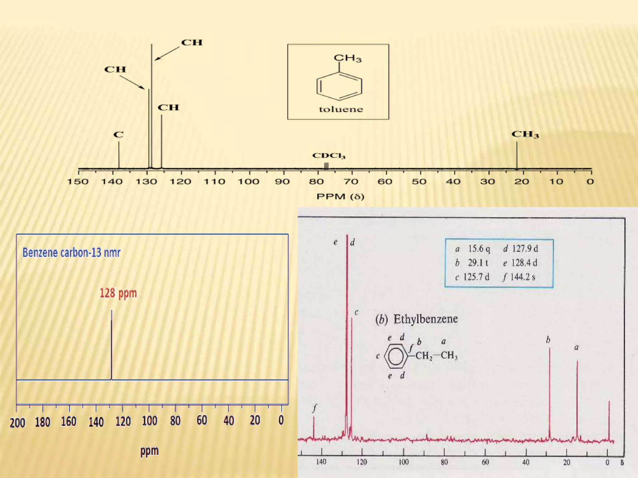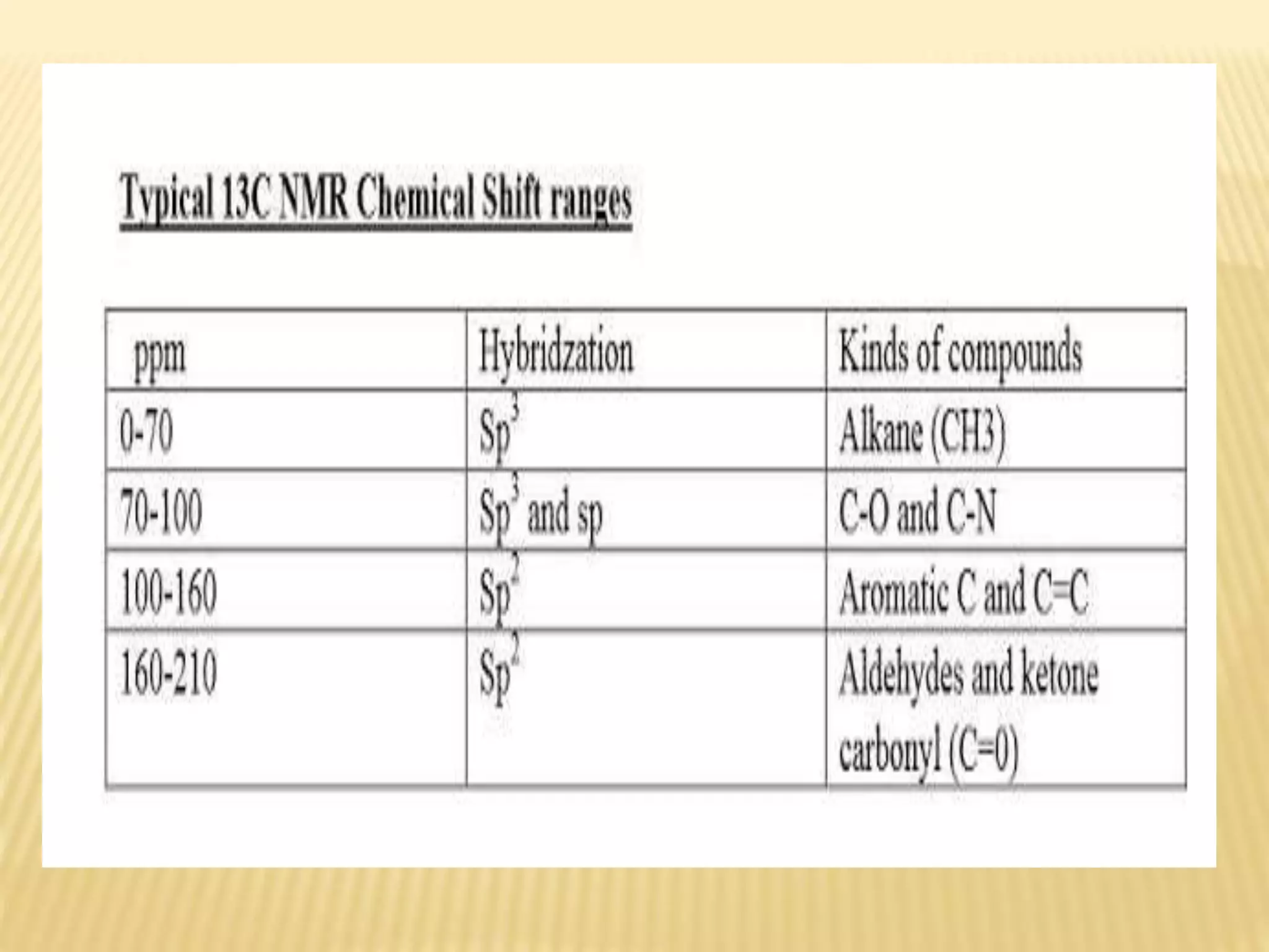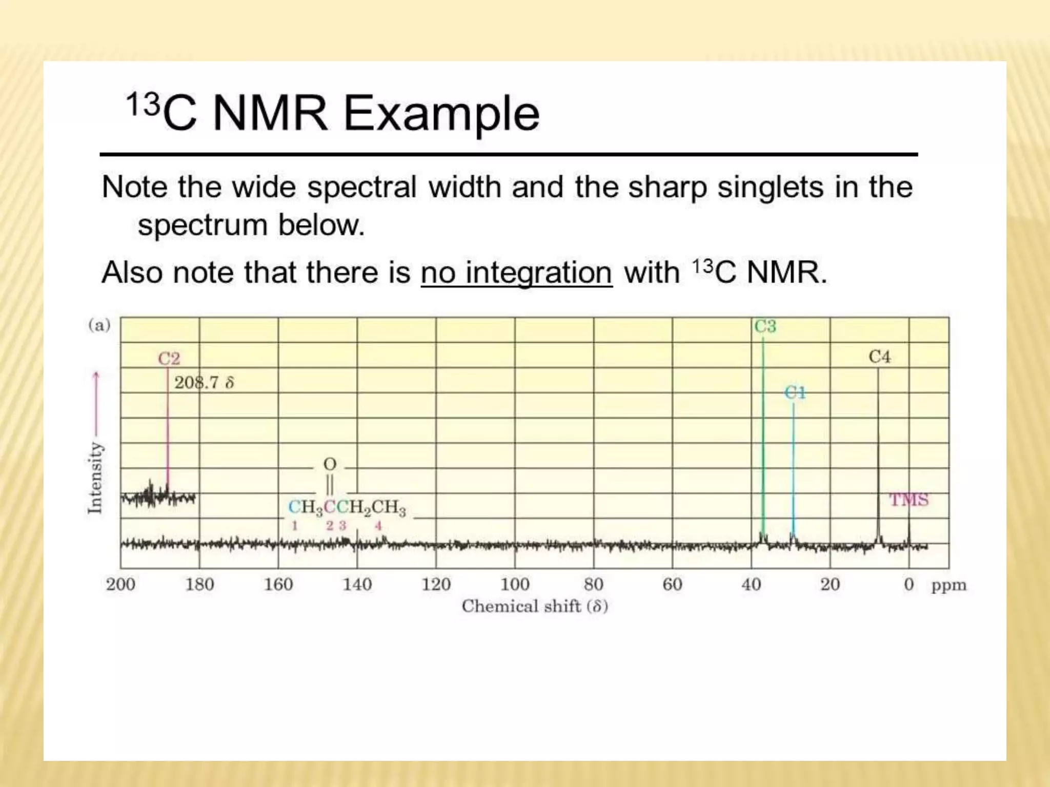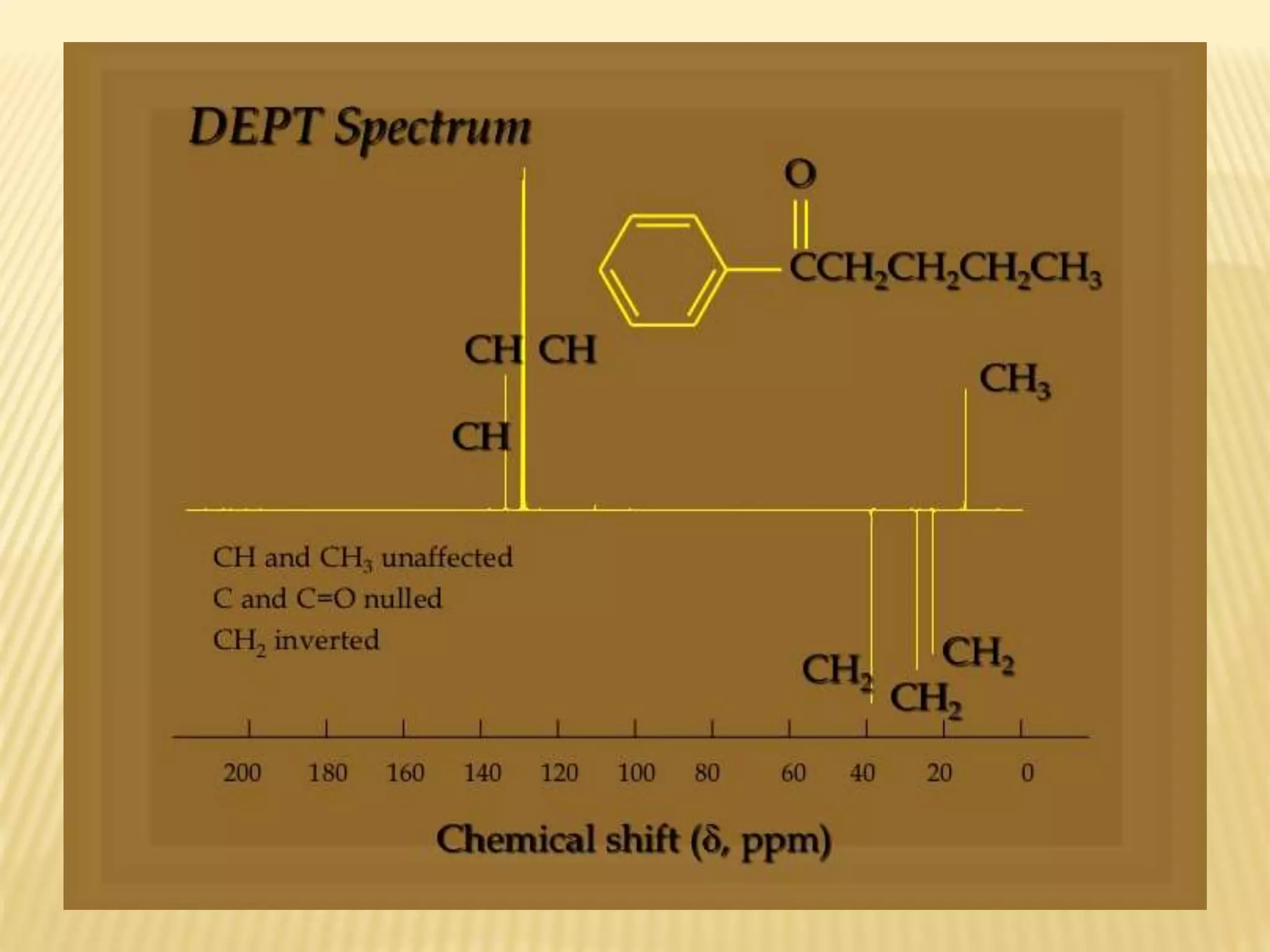 13C-NMR spectroscopy provides information about carbon atoms in organic compounds. It works by applying a strong magnetic field to excite carbon-13 nuclei, which make up about 1% of naturally occurring carbon. The document discusses several key aspects of 13C-NMR including: principles of NMR spectroscopy; chemical shifts and peak assignments; coupling patterns; techniques to overcome low carbon abundance like signal averaging and Fourier transform; and decoupling methods to simplify spectra. Examples are provided to illustrate predicting chemical shifts and interpreting 13C-NMR spectra.