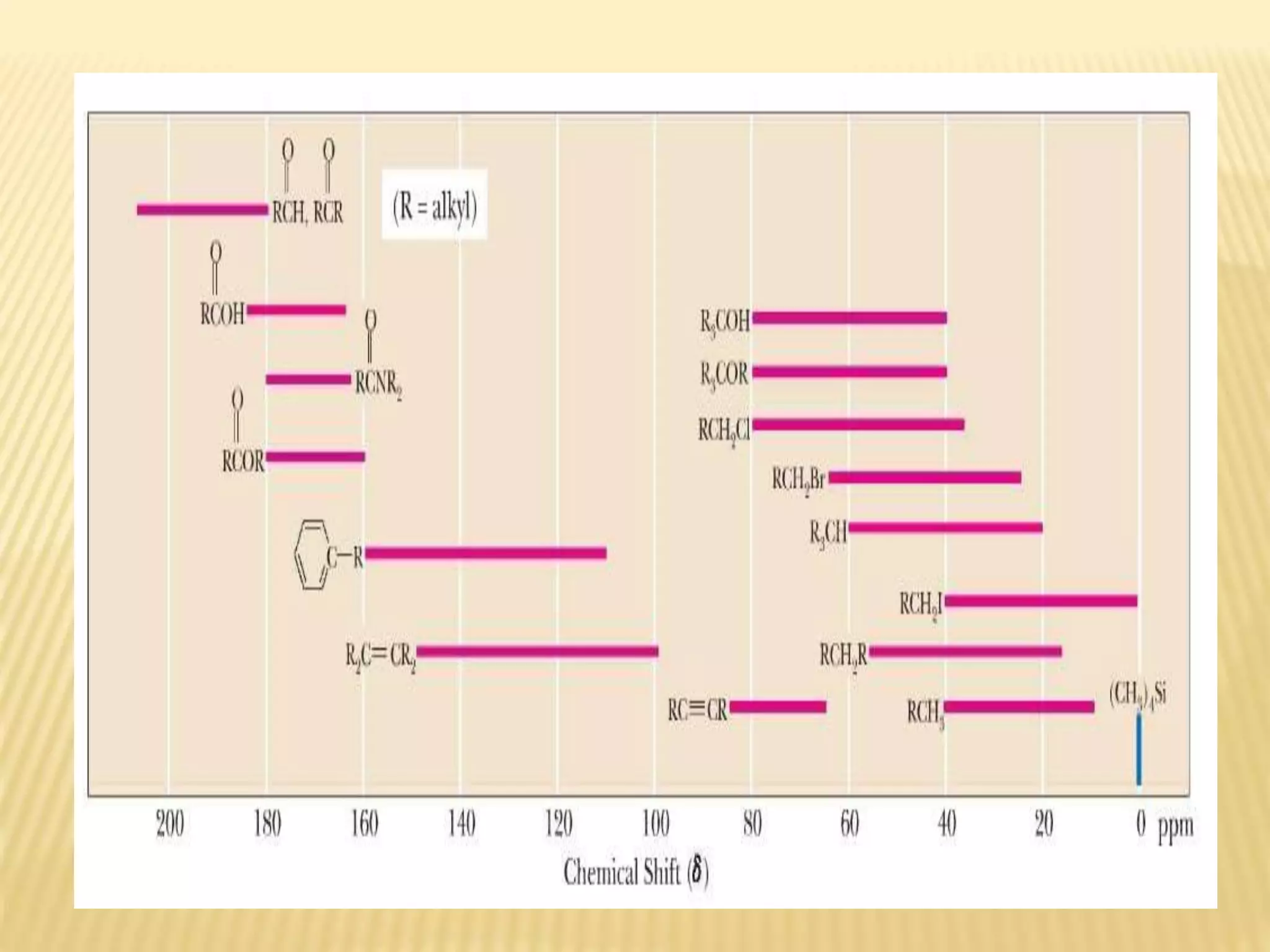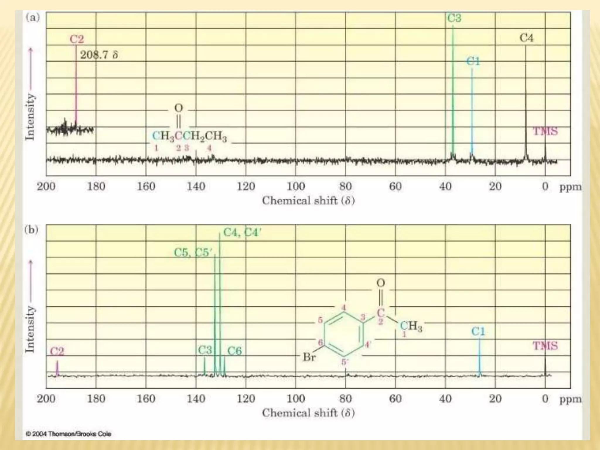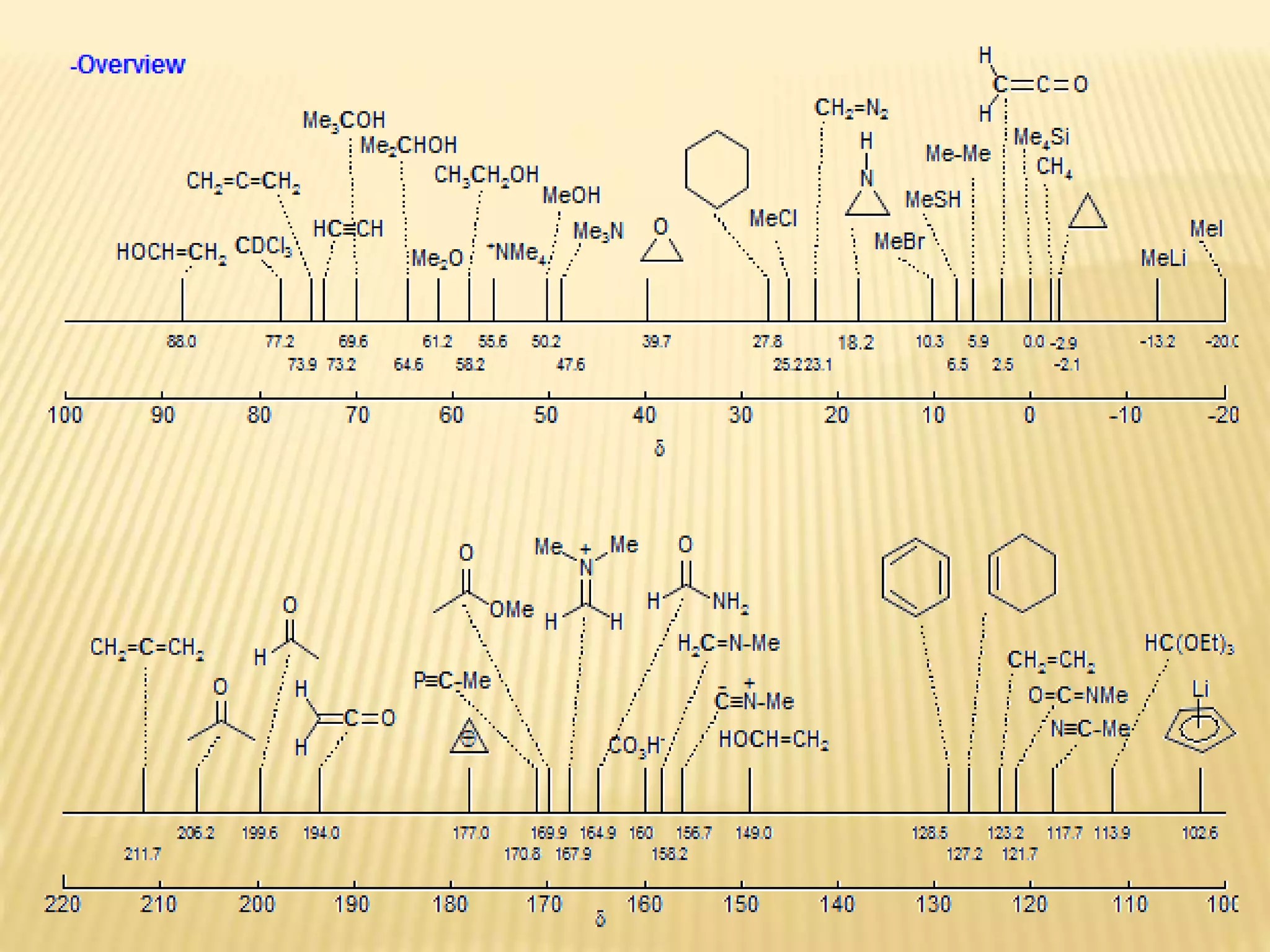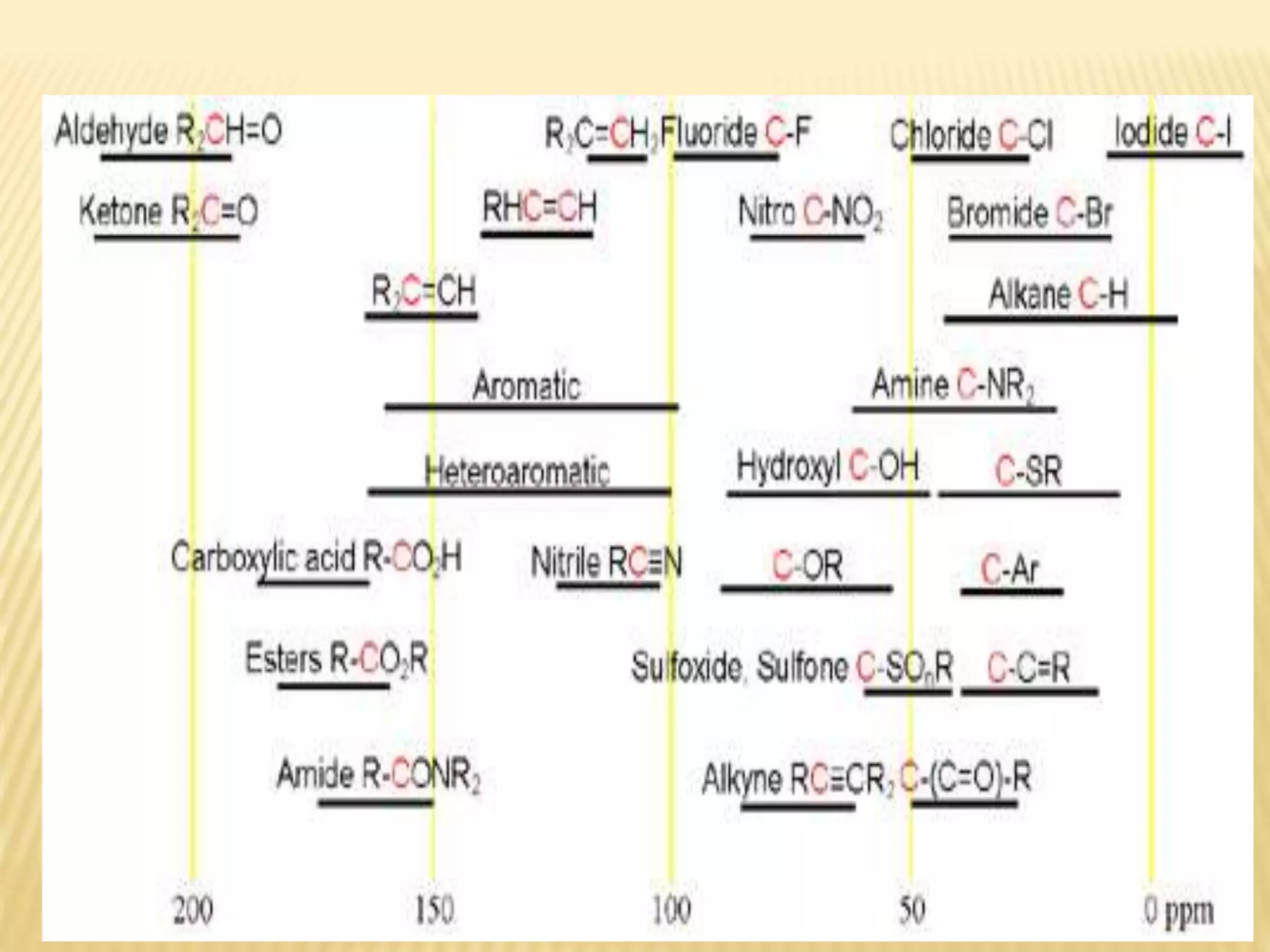13C-NMR spectroscopy provides information about carbon atoms in organic compounds. It works by applying a strong magnetic field to excite carbon-13 nuclei, which make up about 1% of naturally occurring carbon. The document discusses several key aspects of 13C-NMR including: principles of NMR spectroscopy; chemical shifts and peak assignments; coupling patterns; techniques to overcome low carbon abundance like signal averaging and Fourier transform; and decoupling methods to simplify spectra. Examples are provided to illustrate predicting chemical shifts and interpreting 13C-NMR spectra.