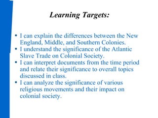 The document provides an overview of the 13 original English colonies in North America, describing their founding dates, purposes, religious influences, and economic systems. It summarizes that the New England colonies were primarily settled by religious dissenters seeking freedom of worship, the middle colonies experienced conflicts over land ownership, and the southern colonies relied heavily on the Atlantic slave trade and plantation economies using indentured servants and slaves.