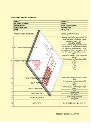 The document outlines costs and pricing strategy for a product or service. It explains that the price charged to customers must be higher than the costs to produce and deliver the product or service. As an example, it provides details on the costs to produce and package styrofoam insulation including materials, labeling, packaging and shipping. It calculates the total cost per unit and proposes setting the sales price high enough to achieve a 50% profit margin.