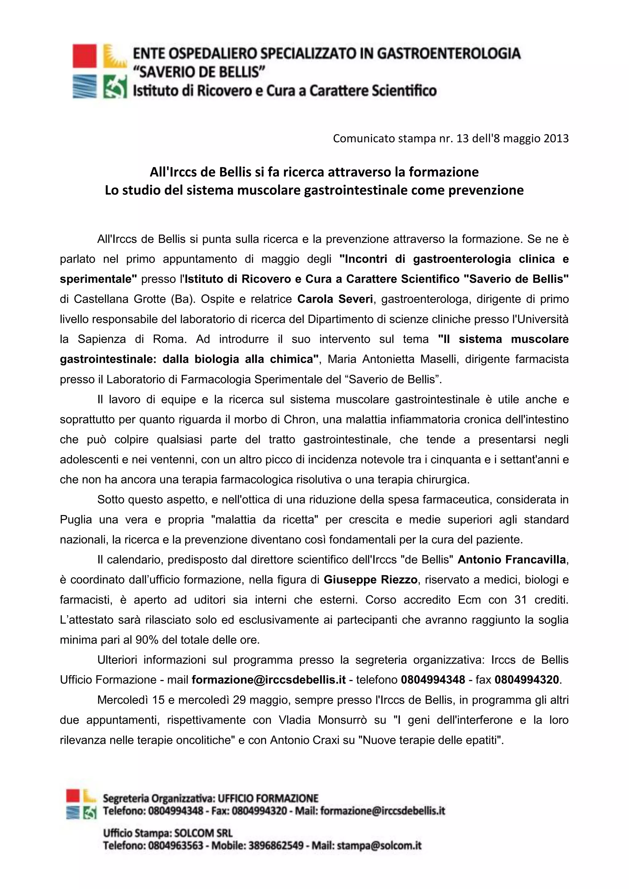Il comunicato stampa nr. 13 dell'8 maggio 2013 annuncia la ricerca e formazione sull'importanza del sistema muscolare gastrointestinale presso l'IRCCS 'Saverio de Bellis'. Durante l'incontro, la gastroenterologa Carola Severi ha discusso le implicazioni della ricerca per il morbo di Chron e l'importanza della prevenzione nella gestione della malattia. Il programma formativo è accreditato ECM e include ulteriori eventi nel mese di maggio.
