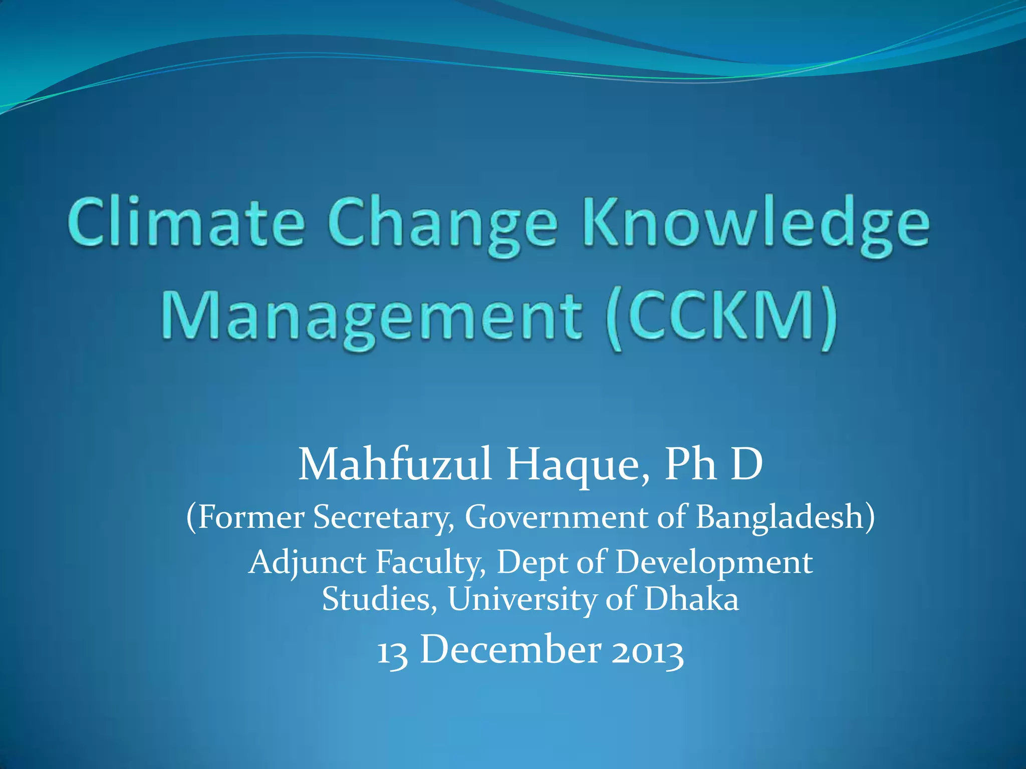 Future Challenges  Whereto host CCKM Centre?  Climate Change Trust (CCT) under the Ministry of Environment and Forests could host such a network  Perhaps, CCKN recently established at the “Climate Change Cell” of the DOE could be a viable candidate for such hosting  How to connect National CC Web-portal with “Access to Information (A2I)” established at the Prime Minister’s Office  Data: Easy access to data; Reliability and updating of data; Data targeting users’ demand and requirements