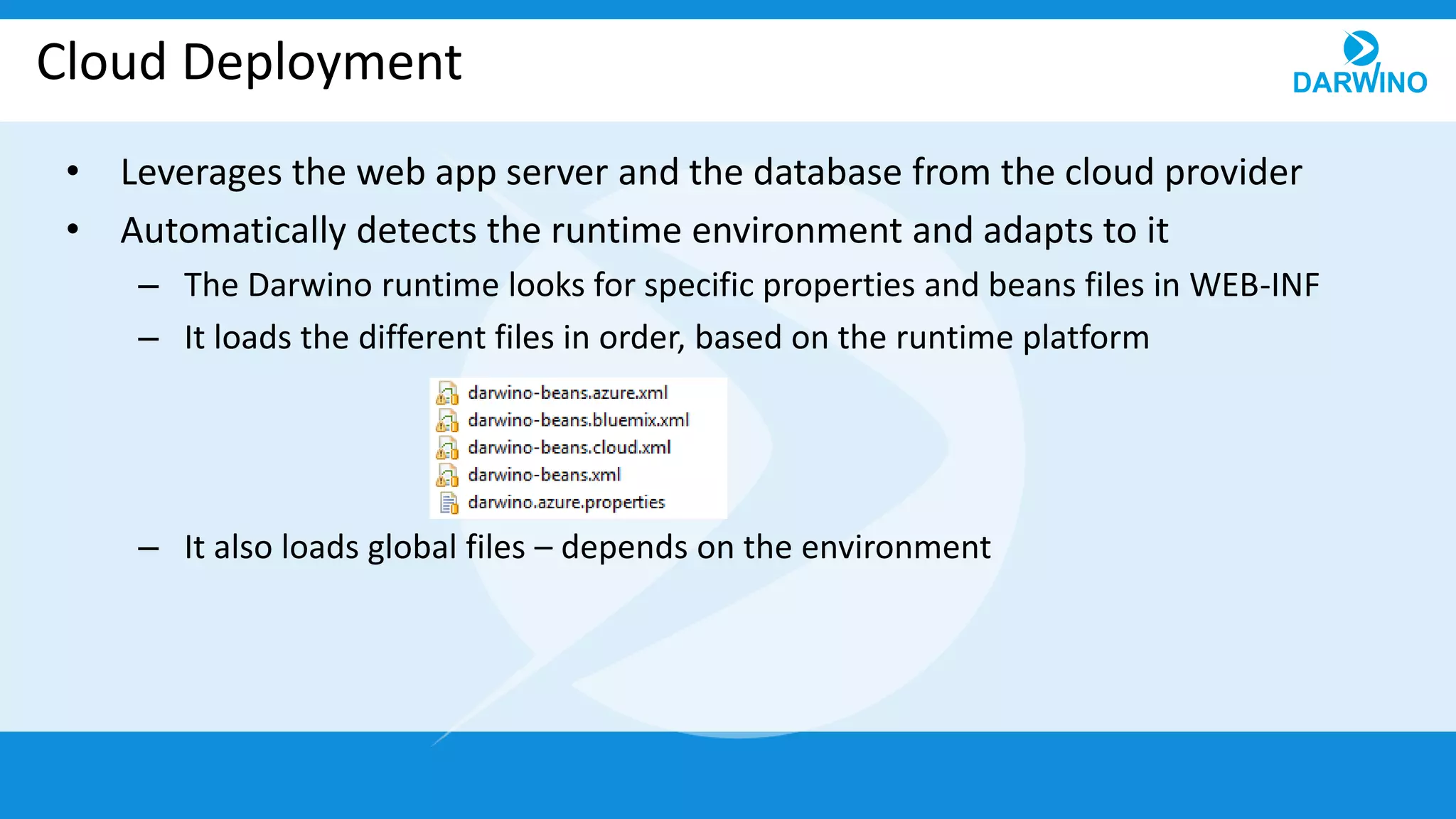This document provides an overview of deploying cloud applications on IBM Bluemix and Microsoft Azure. It details the adaptation of runtime environments, configuration for databases like PostgreSQL and SQL Server, and instructions for using development plugins and managing deployment. It also outlines directory management through LDAP and cloud-specific solutions for user authentication.
