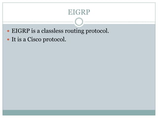 EIGRP and OSPF are hybrid and link-state routing protocols respectively. EIGRP uses the DUAL algorithm and metric system to determine the best paths, while OSPF uses the Dijkstra algorithm and link state advertisements. Both protocols form neighbor relationships to exchange routing information, but OSPF requires adjacencies and is more restrictive in sharing routes between areas.