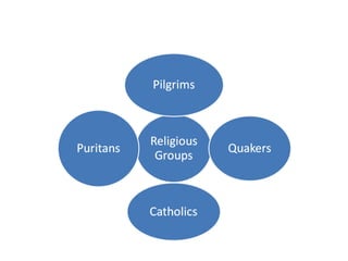 The document discusses the 13 original English colonies in North America, describing their regional differences and some notable figures. It covers: