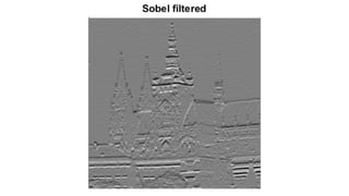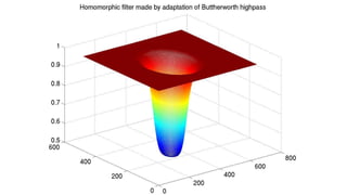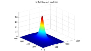 The document discusses various image filtering techniques in the frequency domain. It begins by introducing convolution as frequency domain filtering using the Fourier transform. It then provides examples of low pass and high pass filtering using sharp cut-off and Gaussian filters. Additional topics covered include the Butterworth filter, homomorphic filtering to separate illumination and reflectance, and systematic design of 2D finite impulse response (FIR) filters.