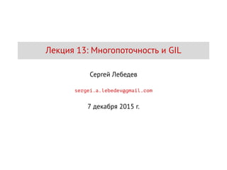 Документ представляет лекцию о многопоточности в Python, включая определение процессов и потоков, их создание и управление через библиотеку threading. Объясняются примитивы синхронизации, такие как мьютексы и семафоры, а также использование модуля queue для работы с очередями. Рассматриваются ограничения, связанные с GIL, и методы параллелизма с использованием модуля multiprocessing.