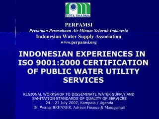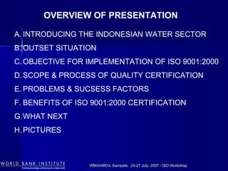 This document discusses the Indonesian experiences with ISO 9001:2000 certification of public water utility services. It provides an overview of the Indonesian water sector and the outset situation of poor service quality and infrastructure issues faced by many utilities. It then details the objectives of seeking ISO certification to improve performance, the scope and process of certification for one utility's water treatment plant, and the problems encountered and success factors. Benefits included reduced equipment breakdowns, lower maintenance times, and improved customer satisfaction through better service quality.