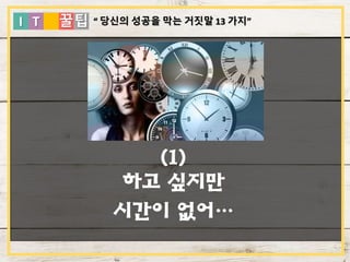 당신의 성공을 막는 거짓말 13 !! 지금 까지 버리지 못했다면 지금부터라도 버려야 할 것입니다. 앞으로의 계획이 있으신가요?? 시작 전 마음을 새로 시작하는데 이만한 명언이 없습니다. 도전하세요. _ 오라클학원/ 자바학원/ 구로학원/ IT학원/ 탑크리에듀교육센터