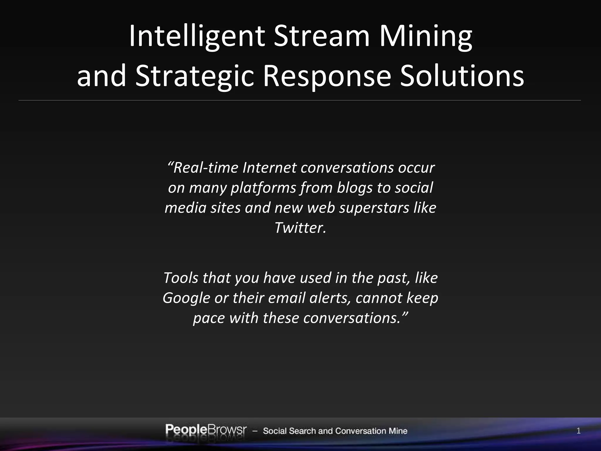 The document discusses PeopleBrowsr, a company that provides real-time social media analytics and monitoring solutions. It describes PeopleBrowsr's tools for mining live conversation data, performing sentiment analysis, and helping clients identify influential users to target in social media campaigns. Case studies are presented showing how PeopleBrowsr has helped companies measure the impact of marketing on social media and target the right influencers.
